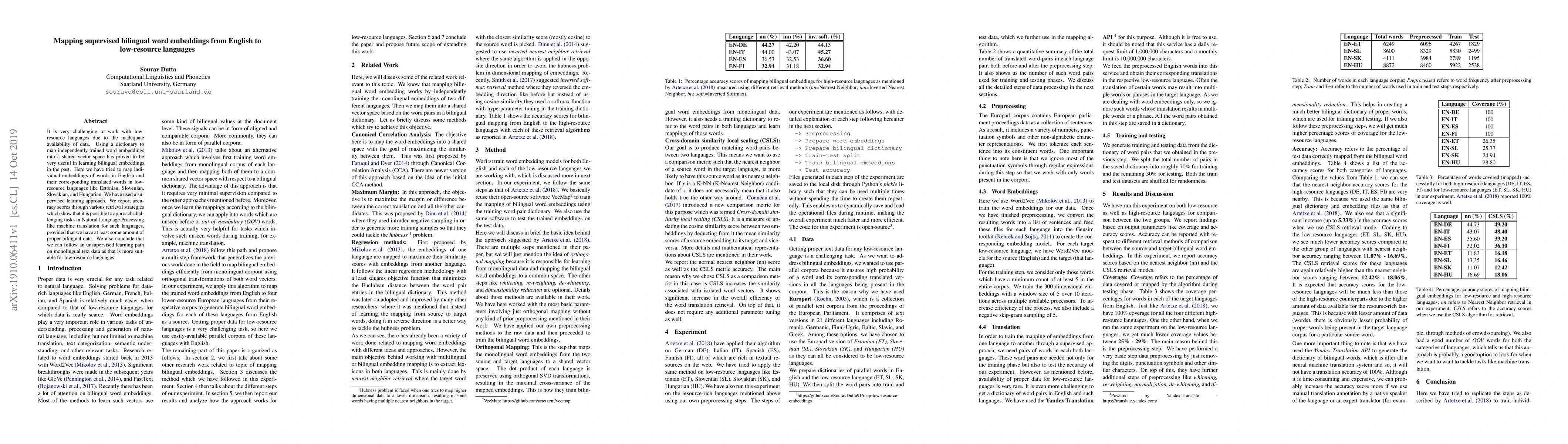 This paper explores supervised bilingual word embeddings for low-resource languages by mapping English embeddings to their corresponding translations in languages like Estonian, Slovenian, Slovakian, and Hungarian using a dictionary. The study demonstrates that with some bilingual data, challenging NLP tasks like machine translation can be approached, while also suggesting unsupervised learning from monolingual text data as a viable alternative for these languages.
