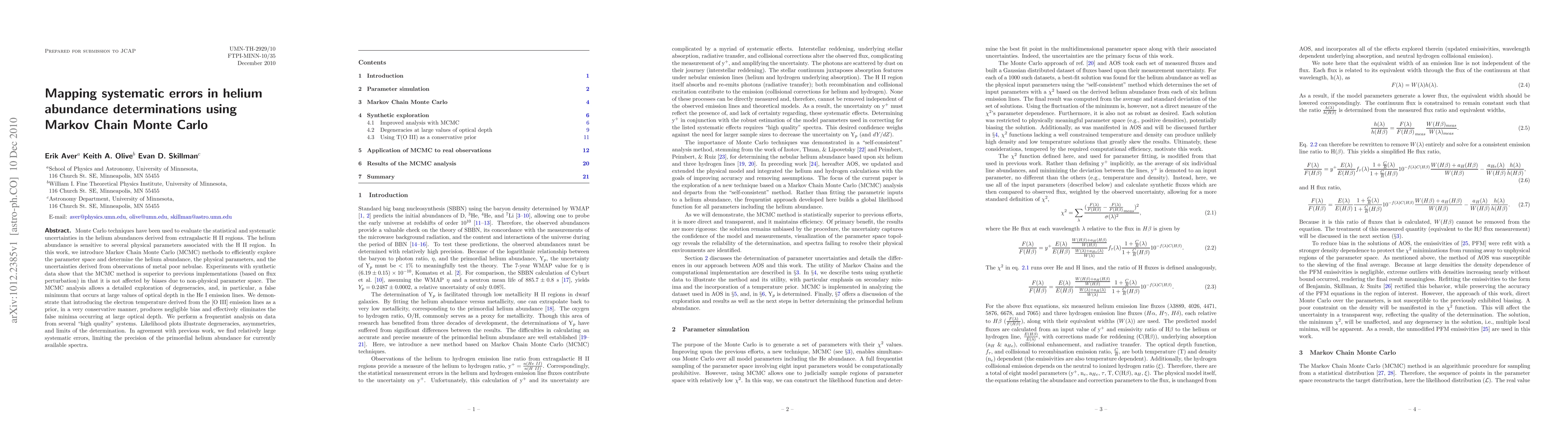 This paper employs Markov Chain Monte Carlo (MCMC) methods to assess systematic and statistical uncertainties in helium abundance determinations from extragalactic H~II regions, revealing superior performance over previous techniques. The MCMC approach effectively addresses biases and false minima, particularly when incorporating electron temperature as a prior, leading to more precise measurements despite significant systematic errors.