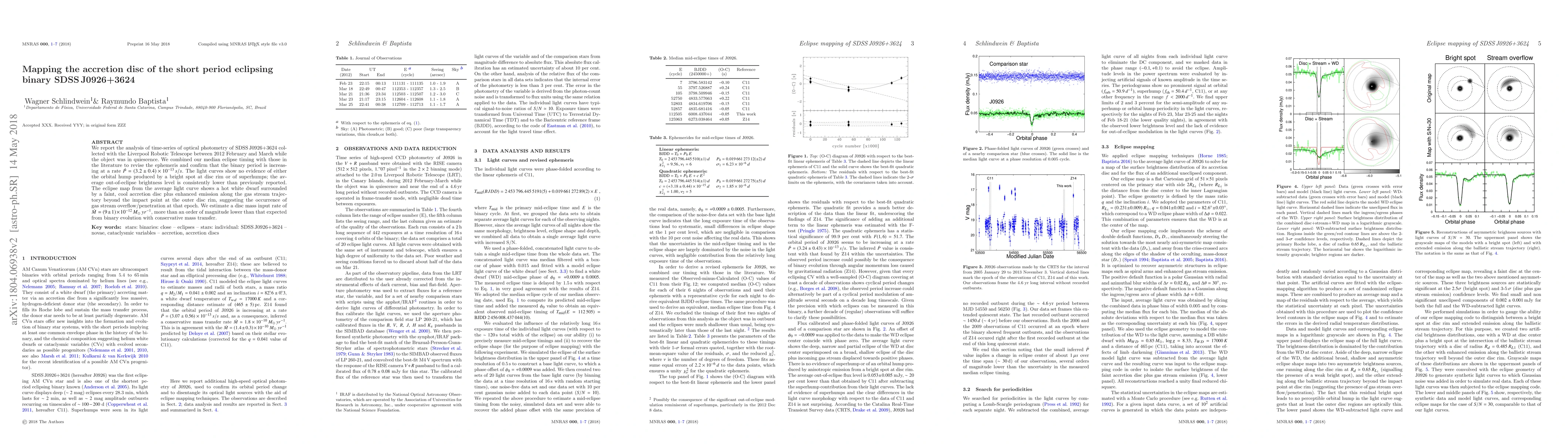 We report the analysis of time-series of optical photometry of SDSS J0926+3624 collected with the Liverpool Robotic Telescope between 2012 February and March while the object was in quiescence. We combined our median eclipse timing with those in the literature to revise the ephemeris and confirm that the binary period is increasing at a rate $\dot{P}=(3.2 \pm 0.4)\times 10^{-13} \, s/s$. The light curves show no evidence of either the orbital hump produced by a bright spot at disc rim or of superhumps; the average out-of-eclipse brightness level is consistently lower than previously reported. The eclipse map from the average light curve shows a hot white dwarf surrounded by a faint, cool accretion disc plus enhanced emission along the gas stream trajectory beyond the impact point at the outer disc rim, suggesting the occurrence of gas stream overflow/penetration at that epoch. We estimate a disc mass input rate of $\dot{M}=(9 \pm 1)\times 10^{-12}\,M_\odot \,yr^{-1}$, more than an order of magnitude lower than that expected from binary evolution with conservative mass transfer.