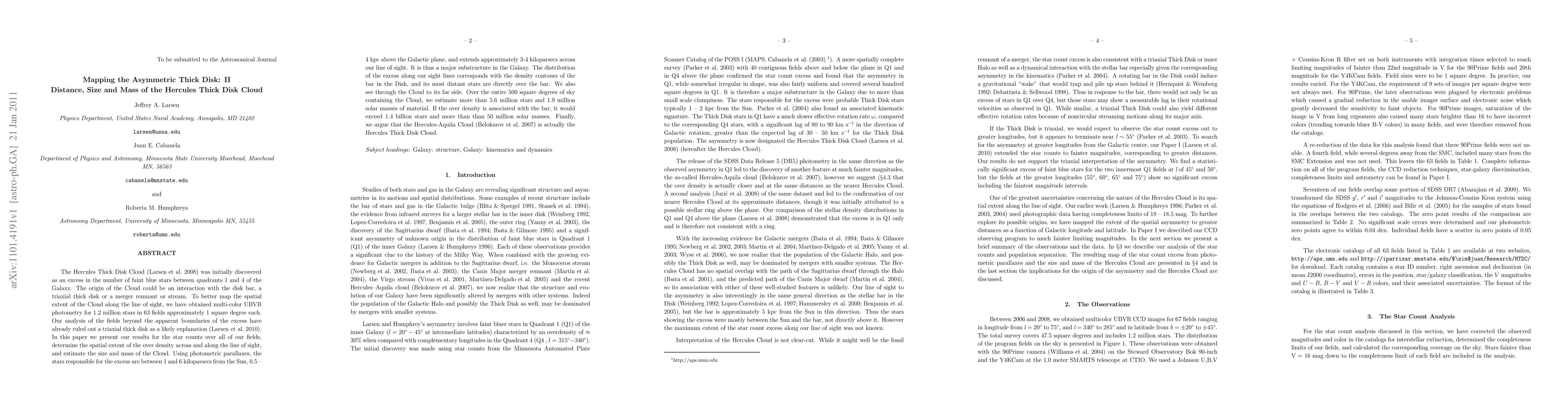 This paper investigates the Hercules Thick Disk Cloud, determining its distance, size, and mass through multi-color UBVR photometry of 1.2 million stars. The findings suggest the Cloud extends 3-4 kpc along the line of sight, contains over 5.6 million stars and 1.9 million solar masses, and aligns with the Galactic bar's density contours.