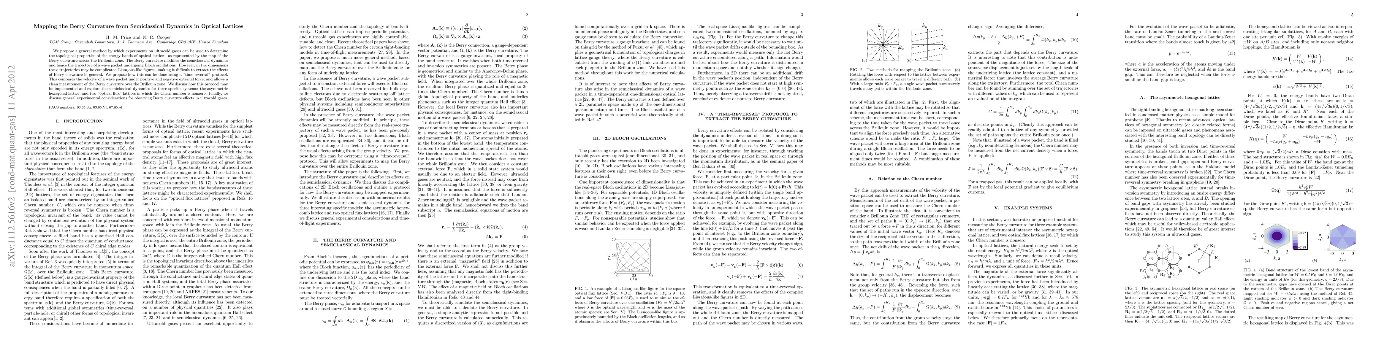 This paper proposes a method to determine the topological properties of optical lattices using ultracold gases, focusing on mapping the Berry curvature via semiclassical dynamics. The authors introduce a "time-reversal" protocol to measure the Berry curvature by comparing wave packet velocities under opposing forces, demonstrating its application in three specific lattice systems.