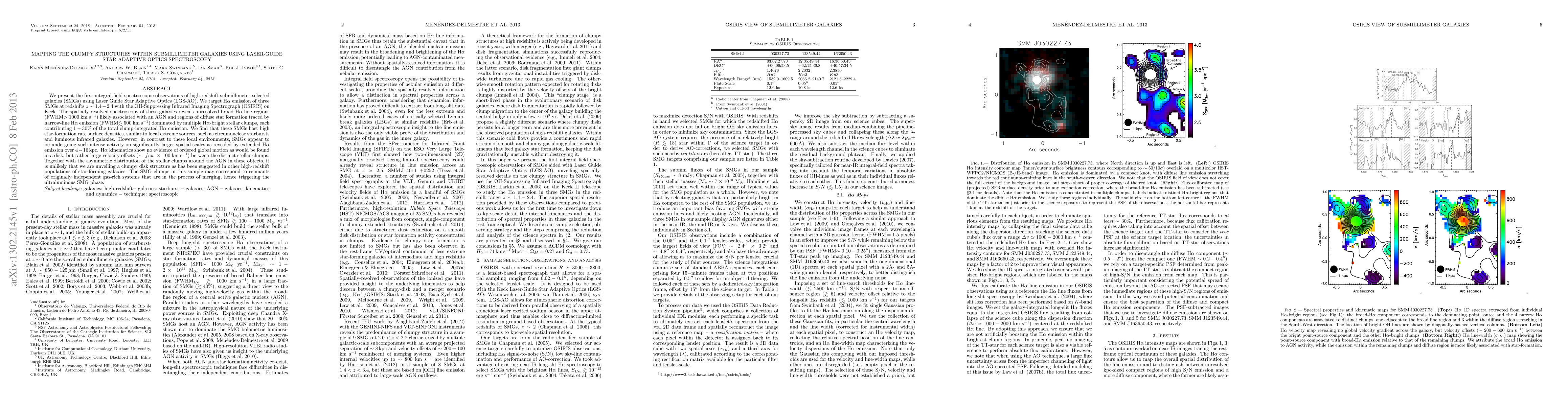 This study uses Laser-Guide Star Adaptive Optics spectroscopy to map the clumpy structures within high-redshift submillimeter galaxies, revealing broad H-alpha lines indicative of AGN activity and narrow lines from star-forming clumps. The galaxies show intense star-formation on large scales, suggesting they may be merging remnants.