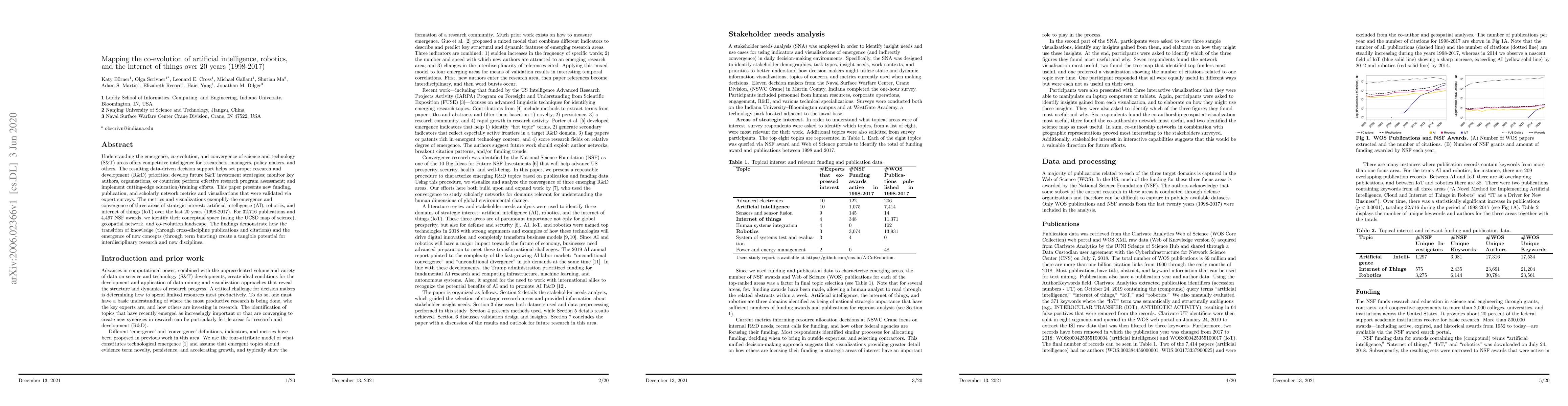 This paper maps the co-evolution of artificial intelligence, robotics, and the internet of things from 1998 to 2017, using new funding, publication, and network metrics to visualize their convergence and identify interdisciplinary research opportunities. The study highlights the transition of knowledge and emergence of new concepts through cross-discipline publications and term bursting.