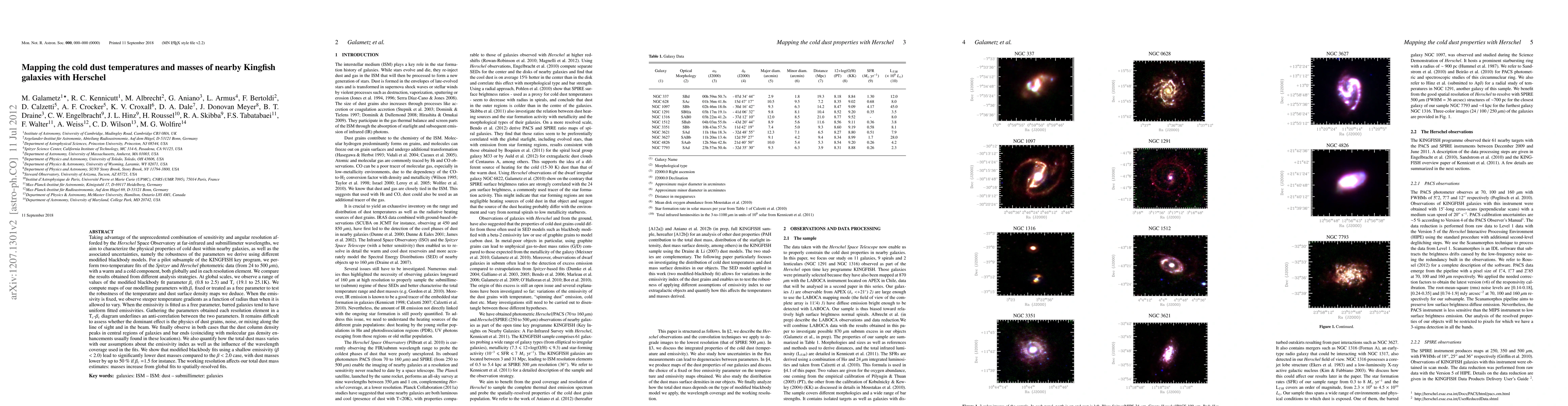 This study uses Herschel data to map cold dust temperatures and masses in nearby Kingfish galaxies, finding significant temperature gradients and dust mass variations depending on emissivity assumptions. The dust column density peaks in central regions and bar ends, correlating with molecular gas enhancements.
