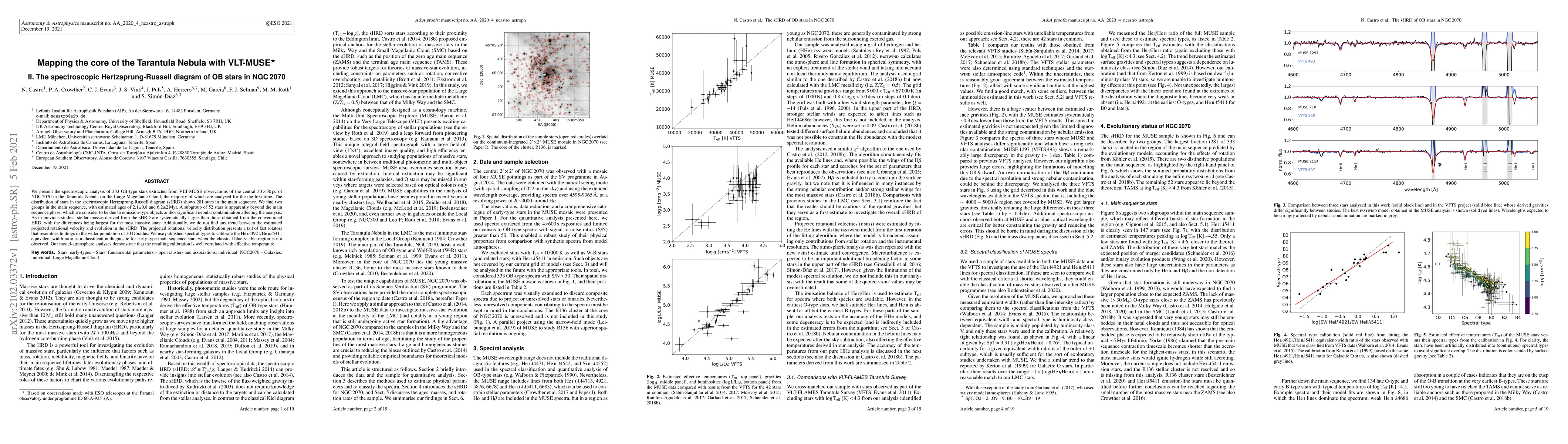 We present the spectroscopic analysis of 333 OB-type stars extracted from VLT-MUSE observations of the central 30 x 30 pc of NGC 2070 in the Tarantula Nebula on the Large Magellanic Cloud, the majority of which are analysed for the the first time. The distribution of stars in the spectroscopic Hertzsprung-Russell diagram (sHRD) shows 281 stars in the main sequence. We find two groups in the main sequence, with estimated ages of 2.1$\pm$0.8 and 6.2$\pm$2 Myr. A subgroup of 52 stars is apparently beyond the main sequence phase, which we consider to be due to emission-type objects and/or significant nebular contamination affecting the analysis. As in previous studies, stellar masses derived from the sHRD are systematically larger than those obtained from the conventional HRD, with the differences being largest for the most massive stars. Additionally, we do not find any trend between the estimated projected rotational velocity and evolution in the sHRD. The projected rotational velocity distribution presents a tail of fast rotators that resembles findings in the wider population of 30 Doradus. We use published spectral types to calibrate the HeI$\lambda$4921/HeII$\lambda$5411 equivalent-width ratio as a classification diagnostic for early-type main sequence stars when the classical blue-visible region is not observed. Our model-atmosphere analyses demonstrate that the resulting calibration is well correlated with effective temperature.