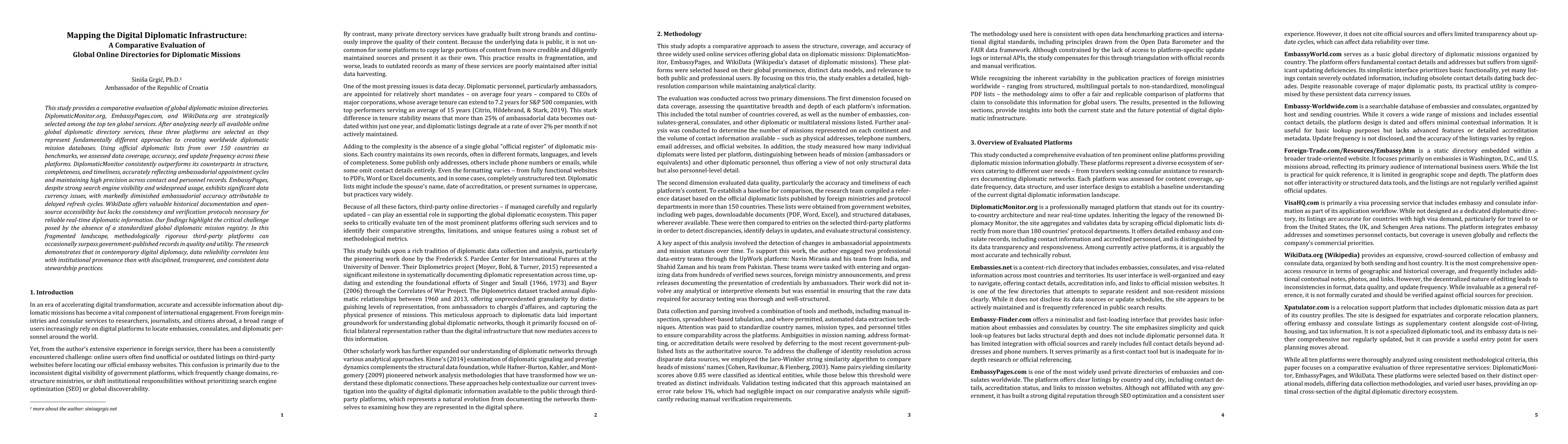 This study conducted a comparative evaluation of three global online directories for diplomatic missions: DiplomaticMonitor.org, EmbassyPages.com, and WikiData.org. The analysis focused on data coverage, accuracy, and update frequency, using official diplomatic lists from over 150 countries as benchmarks.