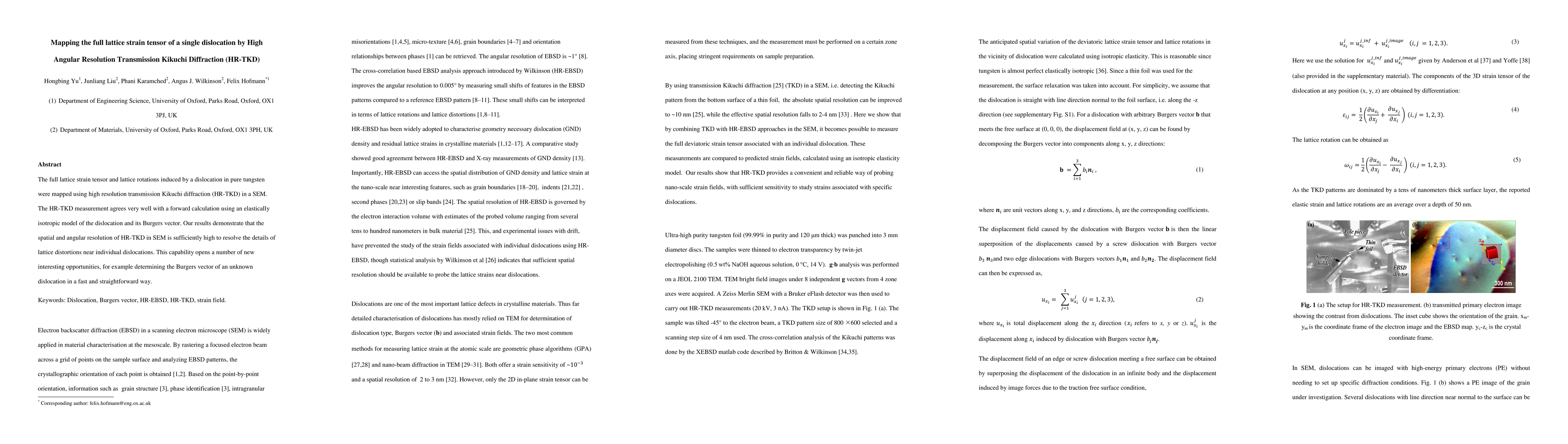 This study uses high-resolution transmission Kikuchi diffraction (HR-TKD) in a SEM to map the full lattice strain tensor and rotations around a dislocation in tungsten, showing excellent agreement with theoretical models. The high spatial and angular resolution of HR-TKD enables detailed analysis of lattice distortions near dislocations, offering new methods for identifying dislocation characteristics.