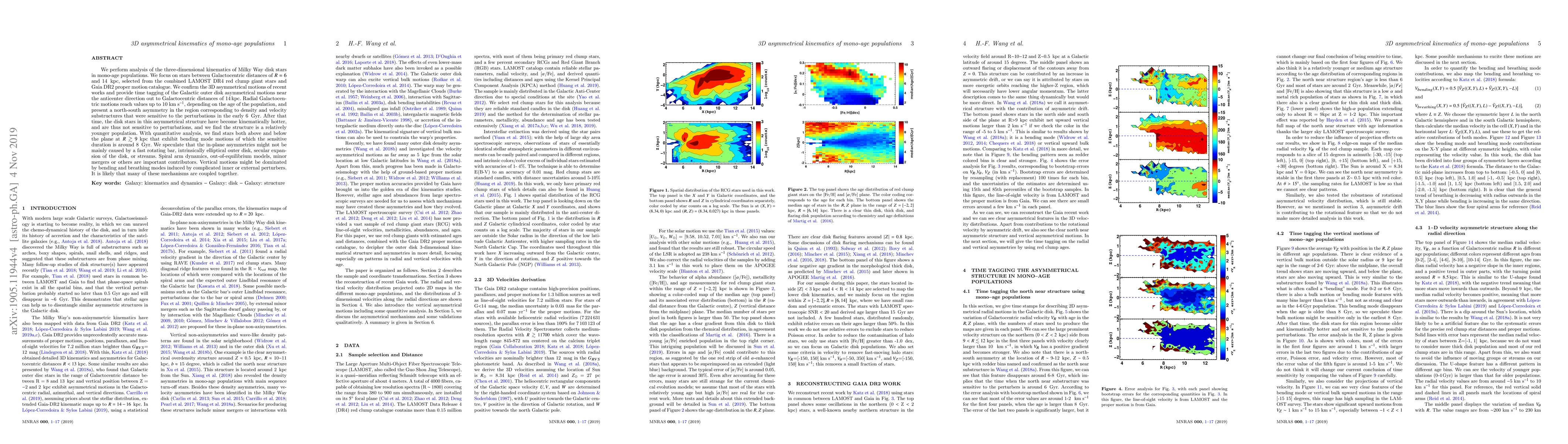 This paper analyzes the three-dimensional kinematics of Milky Way disk stars in mono-age populations, focusing on regions between 6 and 14 kpc. It confirms asymmetrical motions in the outer disk and suggests that spiral arm dynamics and minor mergers are significant contributors to these asymmetries.
