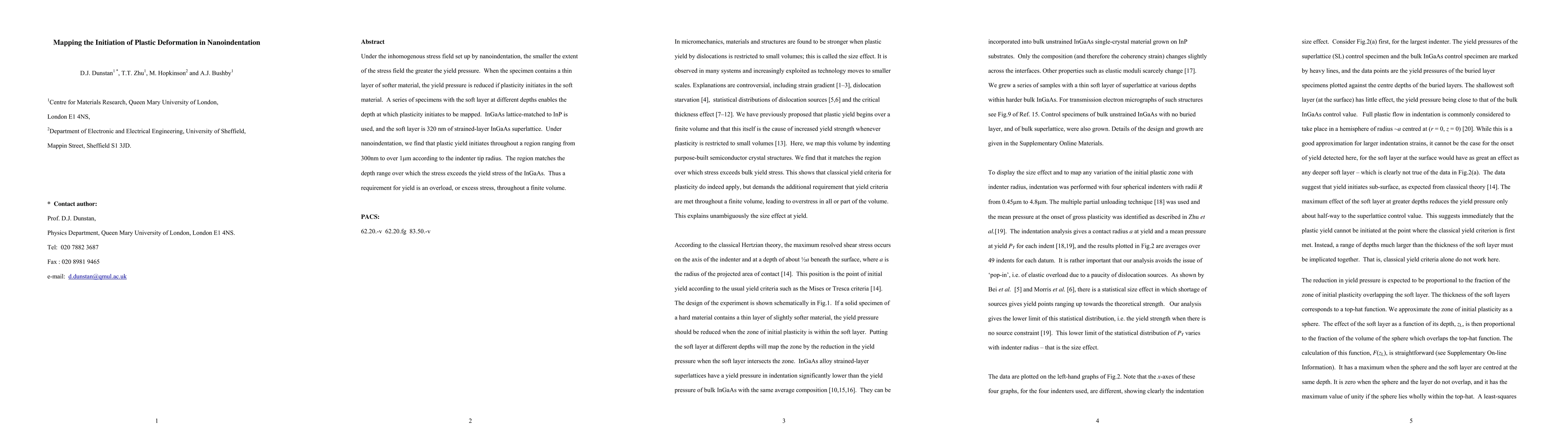 Under the inhomogenous stress field set up by nanoindentation, the smaller the extent of the stress field the greater the yield pressure. When the specimen contains a thin layer of softer material, the yield pressure is reduced if plasticity initiates in the soft material. A series of specimens with the soft layer at different depths enables the depth at which plasticity initiates to be mapped. InGaAs lattice-matched to InP is used, and the soft layer is 320nm of strained-layer InGaAs superlattice. Under nanoindentation, we find that plastic yield initiates throughout a region ranging from 300nm to over 1um depending on the indenter tip radius. The region matches the depth range over which the stress exceeds the yield stress of the InGaAs. Thus a requirement for yield is an overload, or excess stress, throughout a finite volume.