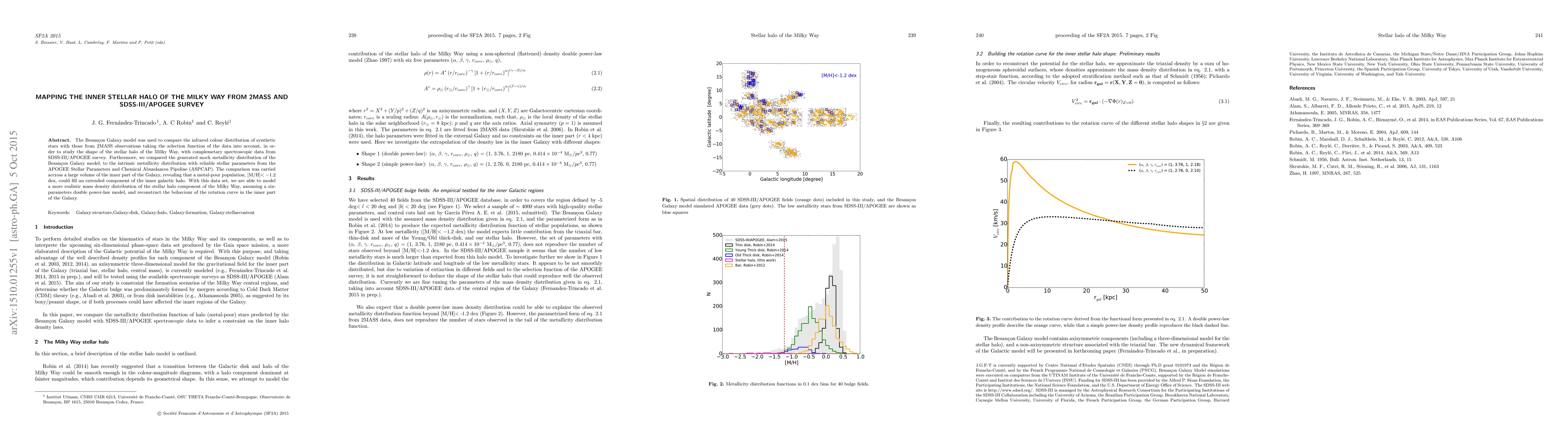The Besan\c{c}on Galaxy model was used to compare the infrared colour distribution of synthetic stars with those from 2MASS observations taking the selection function of the data into account, in order to study the shape of the stellar halo of the Milky Way, with complemetary spectroscopic data from SDSS-III/APOGEE survey. Furthermore, we compared the generated mock metallicity distribution of the Besan\c{c}on Galaxy model, to the intrinsic metallicity distribution with reliable stellar parameters from the APOGEE Stellar Parameters and Chemical Abundances Pipeline (ASPCAP). The comparison was carried accross a large volume of the inner part of the Galaxy, revealing that a metal-poor population, [M/H]$<-1.2$ dex, could fill an extended component of the inner galactic halo. With this data set, we are able to model a more realistic mass density distribution of the stellar halo component of the Milky Way, assuming a six-parameters double power-law model, and reconstruct the behaviour of the rotation curve in the inner part of the Galaxy.