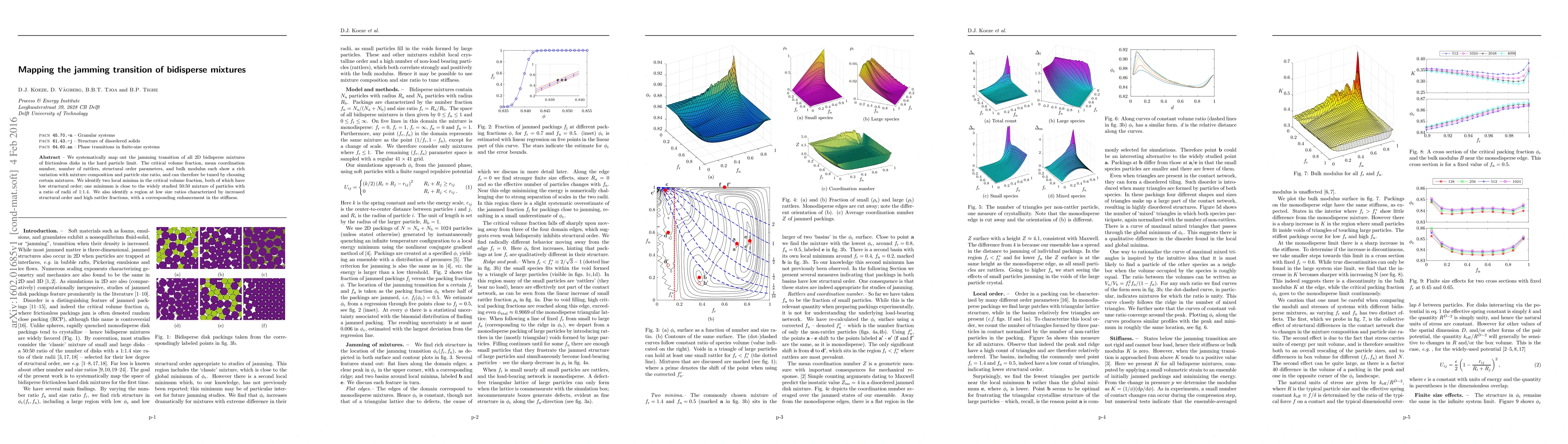 This study maps the jamming transition in 2D bidisperse mixtures of frictionless disks, revealing a complex dependence on composition and size ratio. Key metrics like critical volume fraction and structural order vary significantly, allowing for tuning through specific mixtures, with notable minima in critical volume fraction and enhanced stiffness in certain regions.