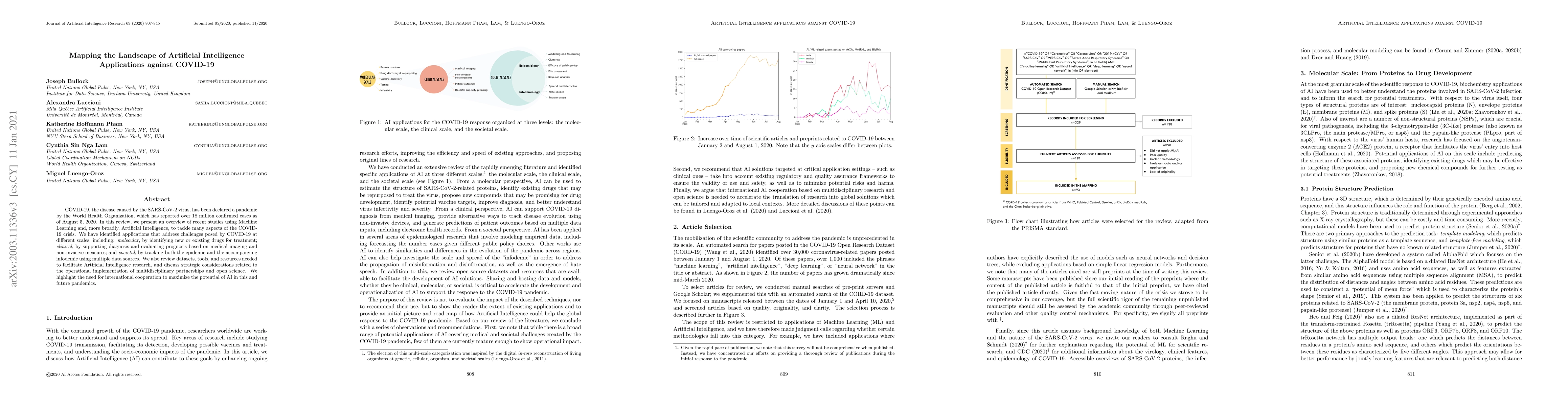 This paper reviews AI applications addressing COVID-19 at molecular, clinical, and societal levels, including drug discovery, diagnosis, and epidemic tracking. It emphasizes the importance of international cooperation and open science for maximizing AI's potential in pandemic responses.