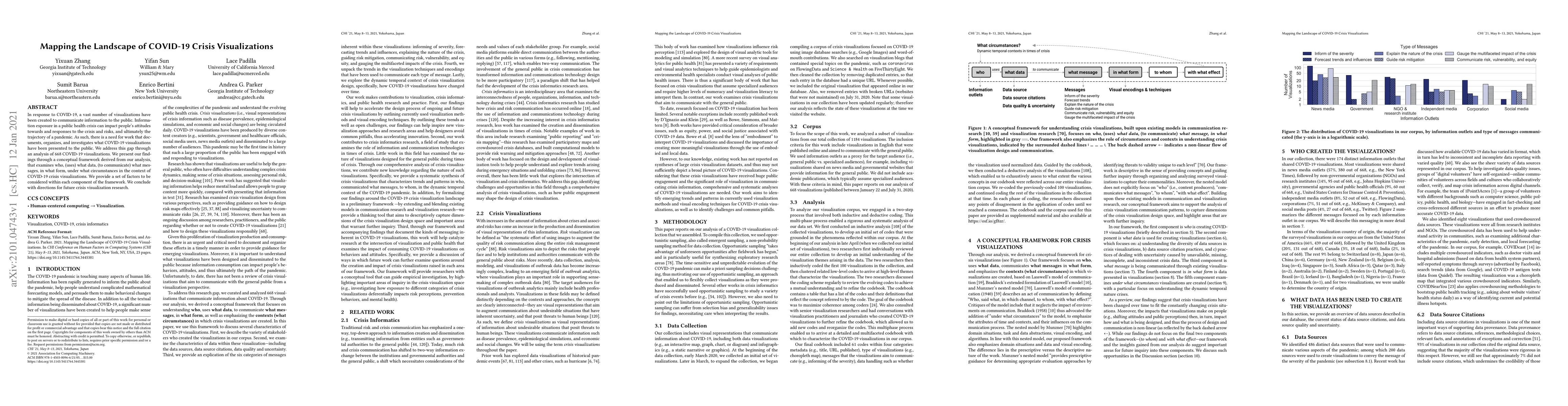 This paper analyzes 668 COVID-19 visualizations to document and organize public health crisis information, presenting a conceptual framework that examines the data sources, messages, and forms used, and concludes with recommendations for future research in crisis visualization.