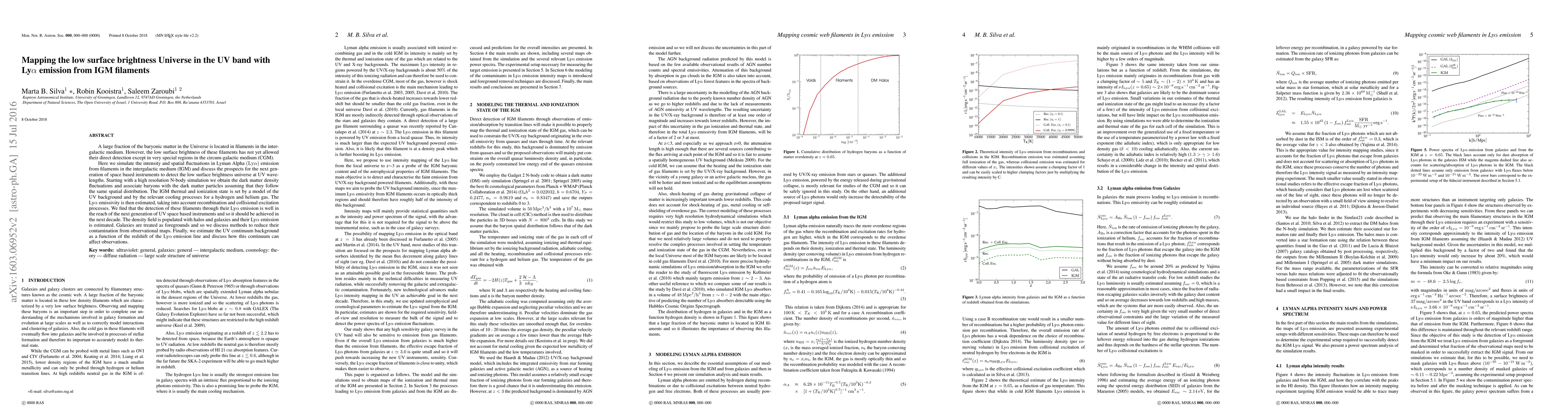 A large fraction of the baryonic matter in the Universe is located in filaments in the intergalactic medium. However, the low surface brightness of these filaments has not yet allowed their direct detection except in very special regions in the circum-galactic medium (CGM). Here we simulate the intensity and spatial fluctuations in Lyman Alpha ${\rm (Ly\alpha)}$ emission from filaments in the intergalactic medium (IGM) and discuss the prospects for the next generation of space based instruments to detect the low surface brightness universe at UV wavelengths. Starting with a high resolution N-body simulation we obtain the dark matter density fluctuations and associate baryons with the dark matter particles assuming that they follow the same spatial distribution. The IGM thermal and ionization state is set by a model of the UV background and by the relevant cooling processes for a hydrogen and helium gas. The ${\rm Ly\alpha}$ emissivity is then estimated, taking into account recombination and collisional excitation processes. We find that the detection of these filaments through their ${\rm Ly\alpha}$ emission is well in the reach of the next generation of UV space based instruments and so it should be achieved in the next decade. The density field is populated with halos and galaxies and their ${\rm Ly\alpha}$ emission is estimated. Galaxies are treated as foregrounds and so we discuss methods to reduce their contamination from observational maps. Finally, we estimate the UV continuum background as a function of the redshift of the ${\rm Ly\alpha}$ emission line and discuss how this continuum can affect observations.