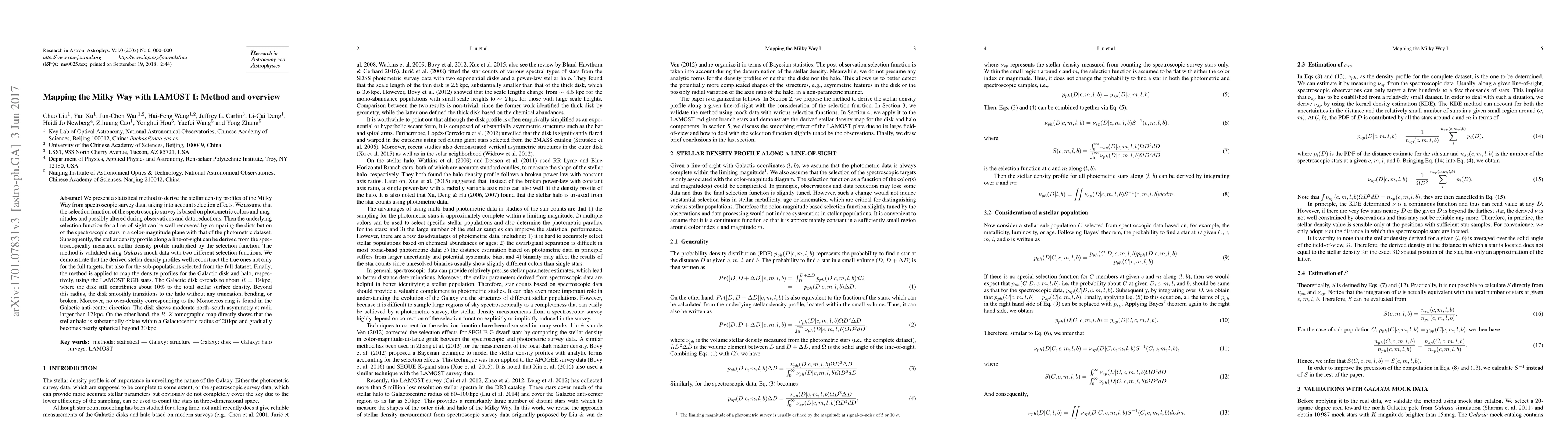 This paper introduces a statistical method to derive the stellar density profiles of the Milky Way using spectroscopic survey data, accounting for selection effects. The method is validated and applied to LAMOST RGB stars, revealing a smoothly transitioning Galactic disk extending to about 19 kpc and a substantially oblate stellar halo within 20 kpc.