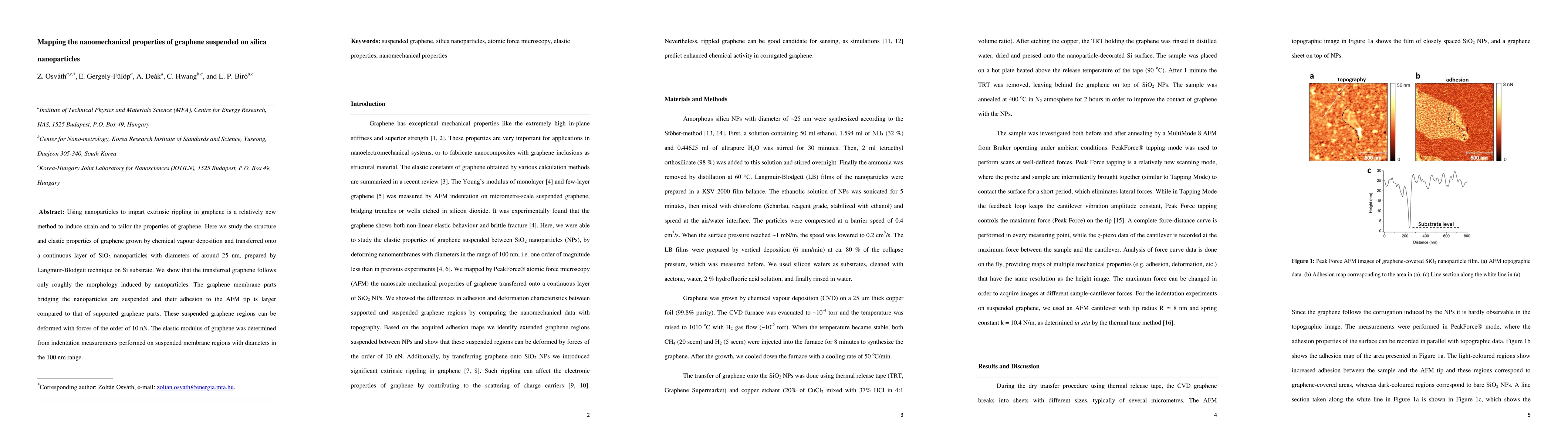 This study investigates the nanomechanical properties of graphene suspended over silica nanoparticles, revealing that graphene bridging nanoparticles forms suspended regions with higher adhesion to AFM tips and elastic modulus determined via indentation, showcasing the potential to tailor graphene's properties through strain induction.