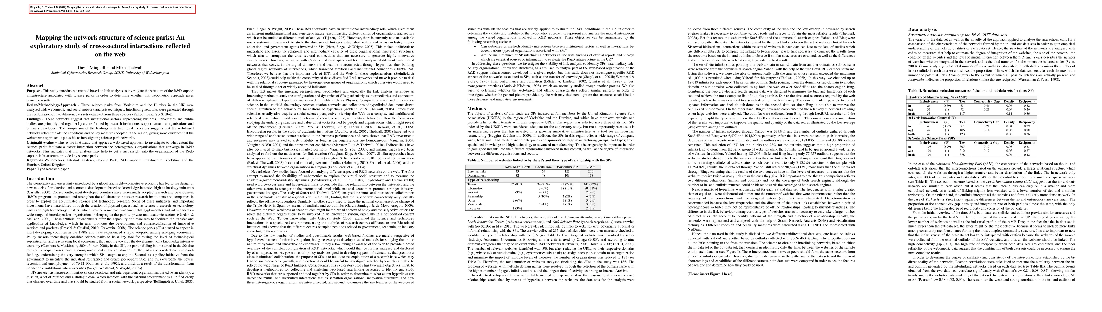 This study employs webometric and social network analysis to explore the R&D support infrastructure of three UK science parks, revealing a core network of research institutions and support organizations. The web-based approach provides plausible insights into cross-sectoral interactions, suggesting it can complement traditional indicators.
