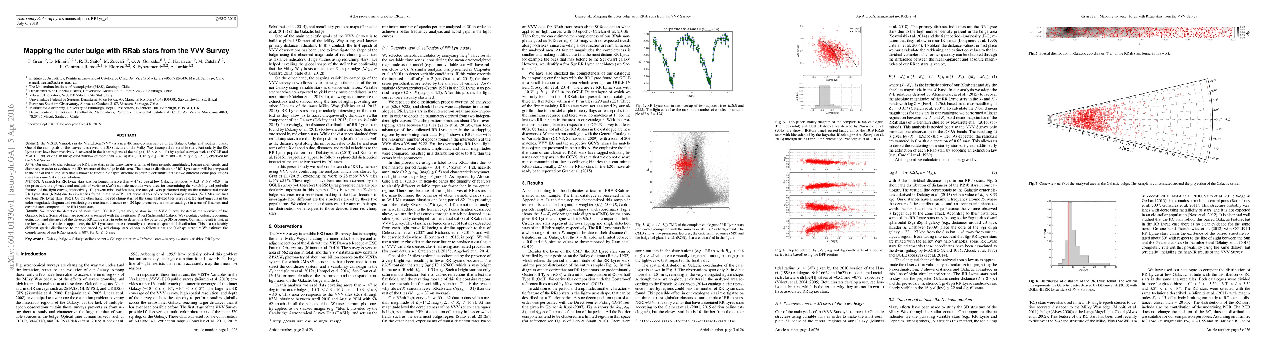 This paper uses RRab stars from the VVV Survey to map the 3D structure of the Milky Way's outer bulge, revealing a centrally concentrated spheroidal distribution that contrasts with the bar and X-shaped structure traced by red clump stars. The study estimates 80% completeness for RRab stars with $K_{\rm s}\lesssim15$ mag.