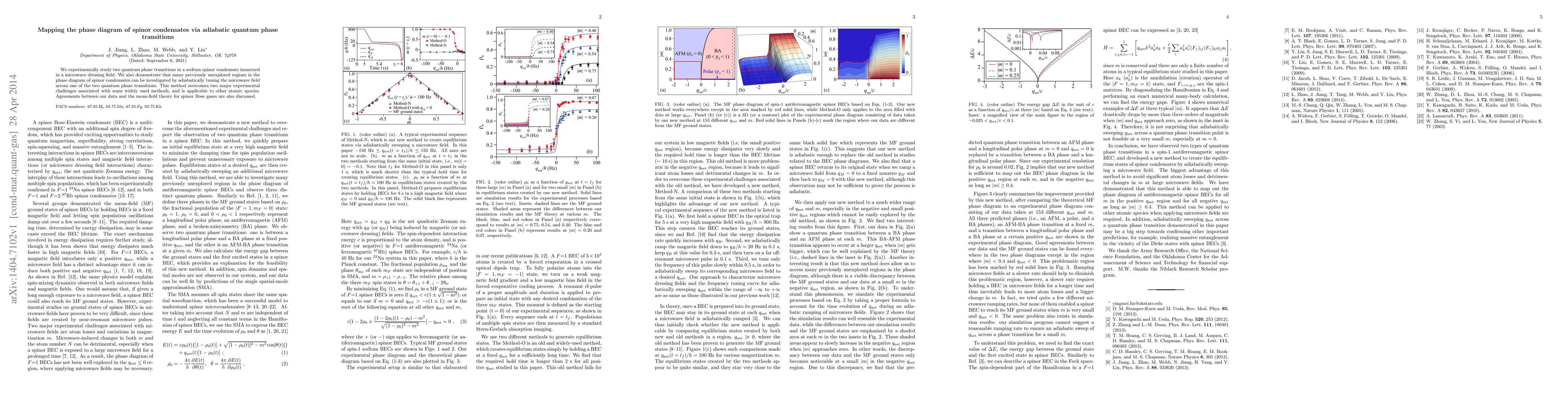 This paper investigates two quantum phase transitions in a sodium spinor condensate using adiabatic tuning of a microwave field, demonstrating a novel approach to explore new regions in the phase diagram. The method addresses significant experimental challenges and is applicable to other atomic species, with results aligning with mean-field theory predictions.