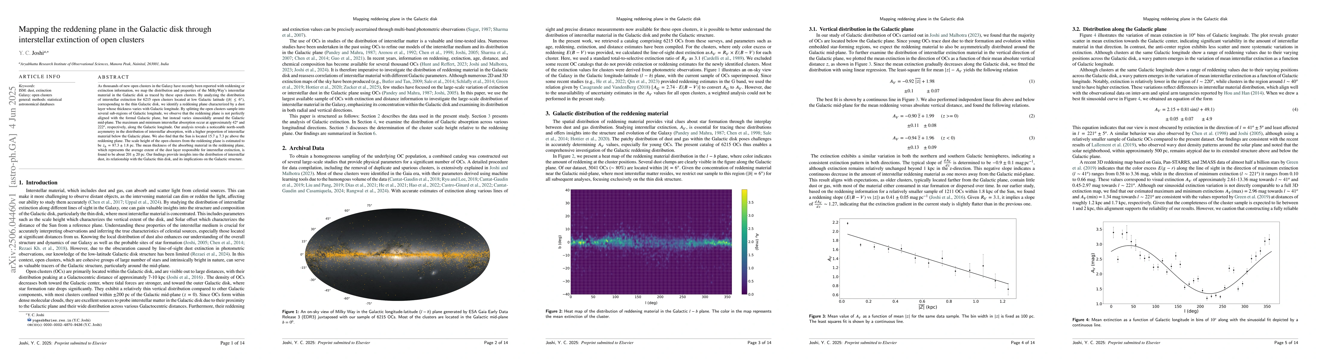 As thousands of new open clusters in the Galaxy have recently been reported with reddening or extinction information, we map the distribution and properties of the Galaxy's interstellar material in the Galactic disk as traced by these open clusters. By analyzing the distribution of interstellar extinction for 6215 open clusters located at low Galactic latitude b <= 6 deg, corresponding to the thin Galactic disk, we identify a reddening plane characterized by a dust layer whose thickness varies with Galactic longitude. By splitting the open clusters sample into several sub-regions of Galactic longitude, we observe that the reddening plane is not perfectly aligned with the formal Galactic plane, but instead varies sinusoidally around the Galactic mid-plane. The maximum and minimum interstellar absorption occur at approximately 42 deg and 222 deg, respectively, along the Galactic longitude. Our analysis reveals a noticeable north-south asymmetry in the distribution of interstellar absorption, with a higher proportion of interstellar material below the Galactic plane. We also find that the Sun is located 15.7 +/- 7.3 pc above the reddening plane. The scale height of the open clusters from the reddening plane is estimated to be z_h = 87.3 +/- 1.8 pc. The mean thickness of the absorbing material in the reddening plane, which represents the average extent of the dust layer responsible for interstellar extinction, is found to be about 201 +/- 20 pc. Our findings provide insights into the distribution of interstellar dust, its relationship with the Galactic thin disk, and its implications for the Galactic structure.