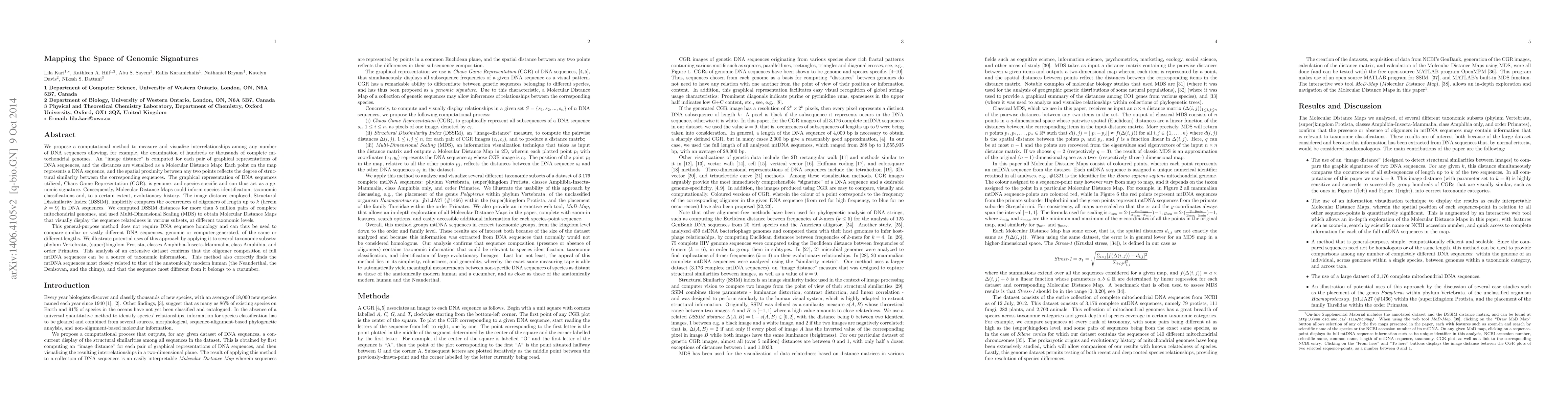 We propose a computational method to measure and visualize interrelationships among any number of DNA sequences allowing, for example, the examination of hundreds or thousands of complete mitochondrial genomes. An "image distance" is computed for each pair of graphical representations of DNA sequences, and the distances are visualized as a Molecular Distance Map: Each point on the map represents a DNA sequence, and the spatial proximity between any two points reflects the degree of structural similarity between the corresponding sequences. The graphical representation of DNA sequences utilized, Chaos Game Representation (CGR), is genome- and species-specific and can thus act as a genomic signature. Consequently, Molecular Distance Maps could inform species identification, taxonomic classifications and, to a certain extent, evolutionary history. The image distance employed, Structural Dissimilarity Index (DSSIM), implicitly compares the occurrences of oligomers of length up to $k$ (herein $k=9$) in DNA sequences. We computed DSSIM distances for more than 5 million pairs of complete mitochondrial genomes, and used Multi-Dimensional Scaling (MDS) to obtain Molecular Distance Maps that visually display the sequence relatedness in various subsets, at different taxonomic levels. This general-purpose method does not require DNA sequence homology and can thus be used to compare similar or vastly different DNA sequences, genomic or computer-generated, of the same or different lengths. We illustrate potential uses of this approach by applying it to several taxonomic subsets: phylum Vertebrata, (super)kingdom Protista, classes Amphibia-Insecta-Mammalia, class Amphibia, and order Primates. This analysis of an extensive dataset confirms that the oligomer composition of full mtDNA sequences can be a source of taxonomic information.
