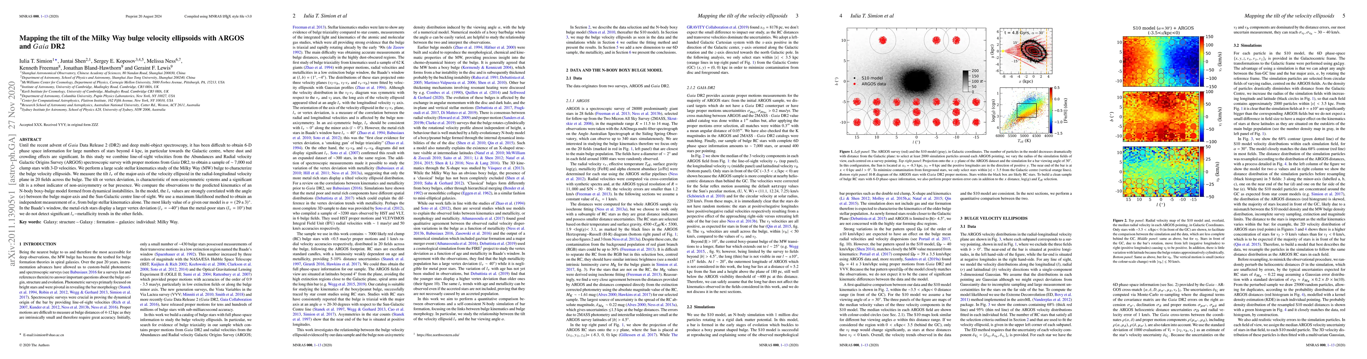 This study combines ARGOS spectroscopy and Gaia DR2 data to analyze the 3-D velocities of approximately 7,000 red clump stars in the Milky Way bulge, measuring the tilt of the velocity ellipsoids to infer the presence of non-axisymmetric structures like bars. The analysis suggests a significant tilt indicative of such structures, with an angle α between the bulge major-axis and the Sun-Galactic center line-of-sight of 29° ± 3°.