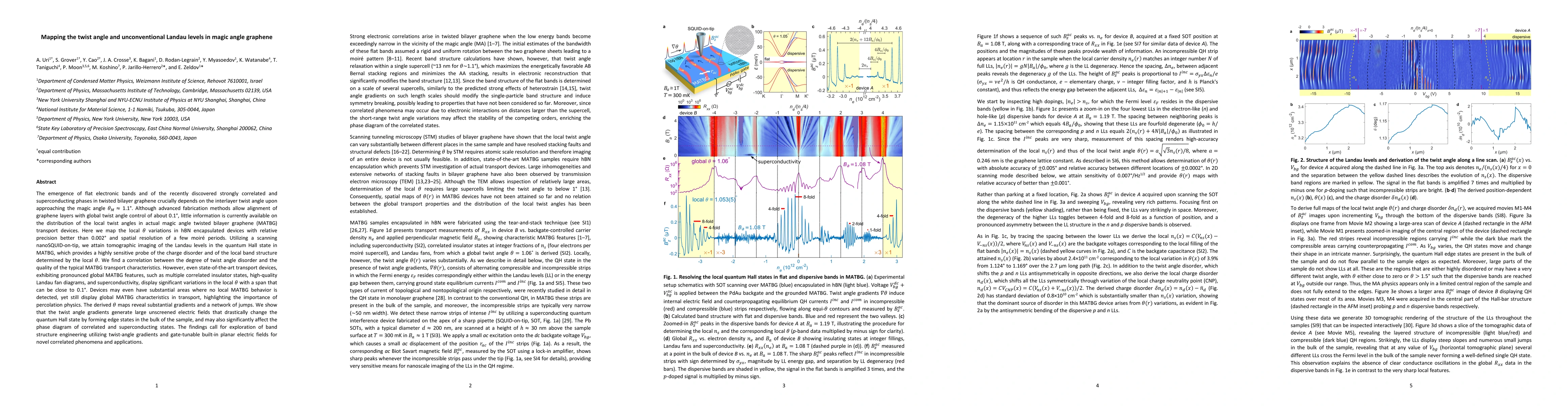 The emergence of flat electronic bands and of the recently discovered strongly correlated and superconducting phases in twisted bilayer graphene crucially depends on the interlayer twist angle upon approaching the magic angle $\theta_M \approx 1.1\deg$. Although advanced fabrication methods allow alignment of graphene layers with global twist angle control of about 0.1$\deg$, little information is currently available on the distribution of the local twist angles in actual magic angle twisted bilayer graphene (MATBG) transport devices. Here we map the local $\theta$ variations in hBN encapsulated devices with relative precision better than 0.002$\deg$ and spatial resolution of a few moir$\'e$ periods. Utilizing a scanning nanoSQUID-on-tip, we attain tomographic imaging of the Landau levels in the quantum Hall state in MATBG, which provides a highly sensitive probe of the charge disorder and of the local band structure determined by the local $\theta$. We find that even state-of-the-art devices, exhibiting high-quality global MATBG features including superconductivity, display significant variations in the local $\theta$ with a span close to 0.1$\deg$. Devices may even have substantial areas where no local MATBG behavior is detected, yet still display global MATBG characteristics in transport, highlighting the importance of percolation physics. The derived $\theta$ maps reveal substantial gradients and a network of jumps. We show that the twist angle gradients generate large unscreened electric fields that drastically change the quantum Hall state by forming edge states in the bulk of the sample, and may also significantly affect the phase diagram of correlated and superconducting states. The findings call for exploration of band structure engineering utilizing twist-angle gradients and gate-tunable built-in planar electric fields for novel correlated phenomena and applications.