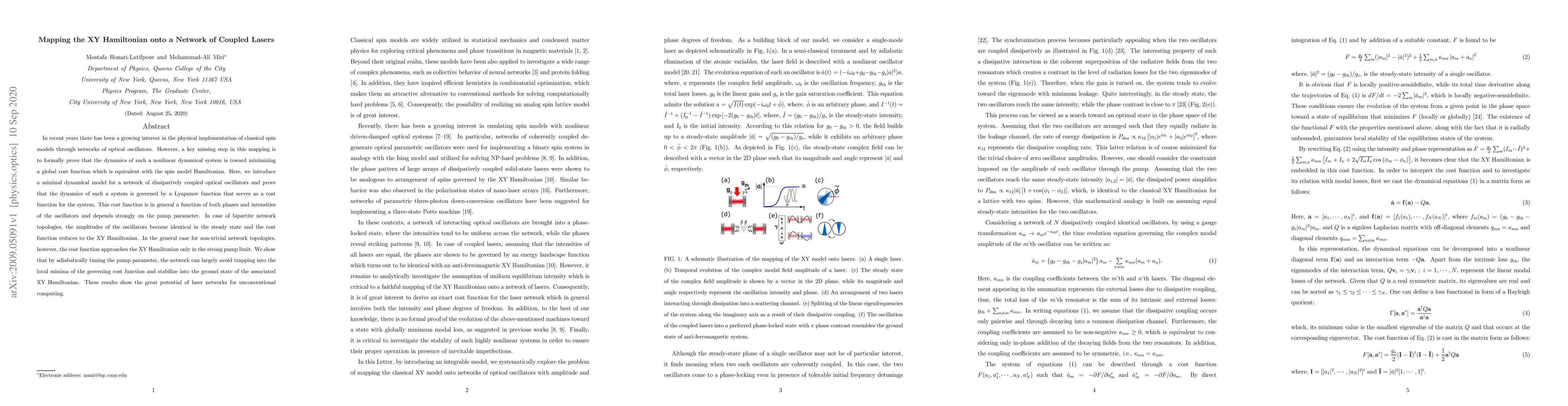 In recent years there has been a growing interest in the physical implementation of classical spin models through networks of optical oscillators. However, a key missing step in this mapping is to formally prove that the dynamics of such a nonlinear dynamical system is toward minimizing a global cost function which is equivalent with the spin model Hamiltonian. Here, we introduce a minimal dynamical model for a network of dissipatively coupled optical oscillators and prove that the dynamics of such a system is governed by a Lyapunov function that serves as a cost function for the system. This cost function is in general a function of both phases and intensities of the oscillators and depends strongly on the pump parameter. In case of bipartite network topologies, the amplitudes of the oscillators become identical in the steady state and the cost function reduces to the XY Hamiltonian. In the general case for non-trivial network topologies, however, the cost function approaches the XY Hamiltonian only in the strong pump limit. We show that by adiabatically tuning the pump parameter, the network can largely avoid trapping into the local minima of the governing cost function and stabilize into the ground state of the associated XY Hamiltonian. These results show the great potential of laser networks for unconventional computing.