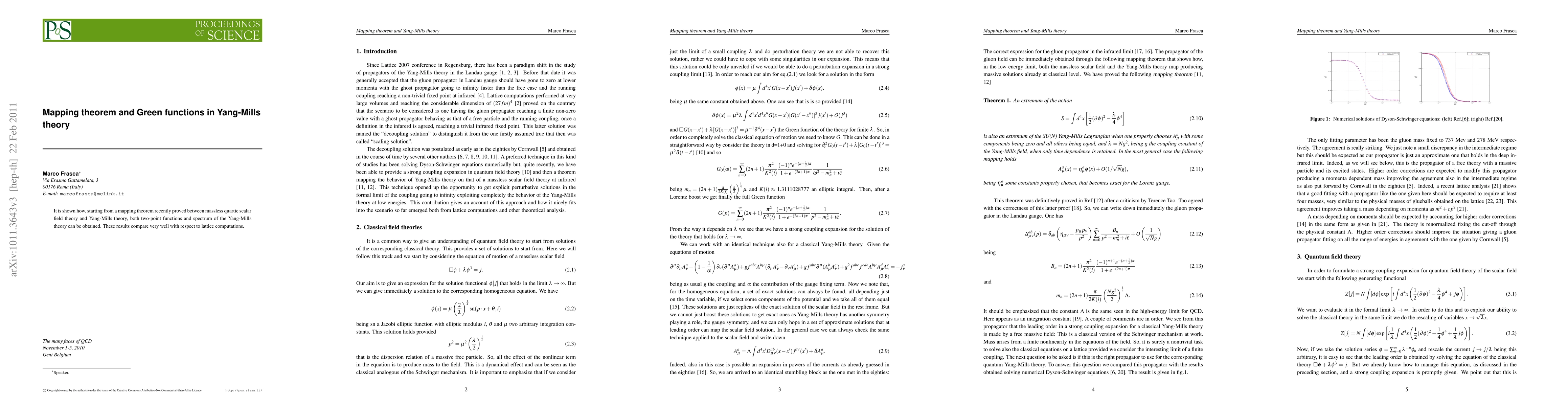 This paper demonstrates how a recently established mapping theorem connects massless quartic scalar field theory to Yang-Mills theory, allowing derivation of two-point functions and the spectrum of Yang-Mills theory, which align closely with lattice computations.
