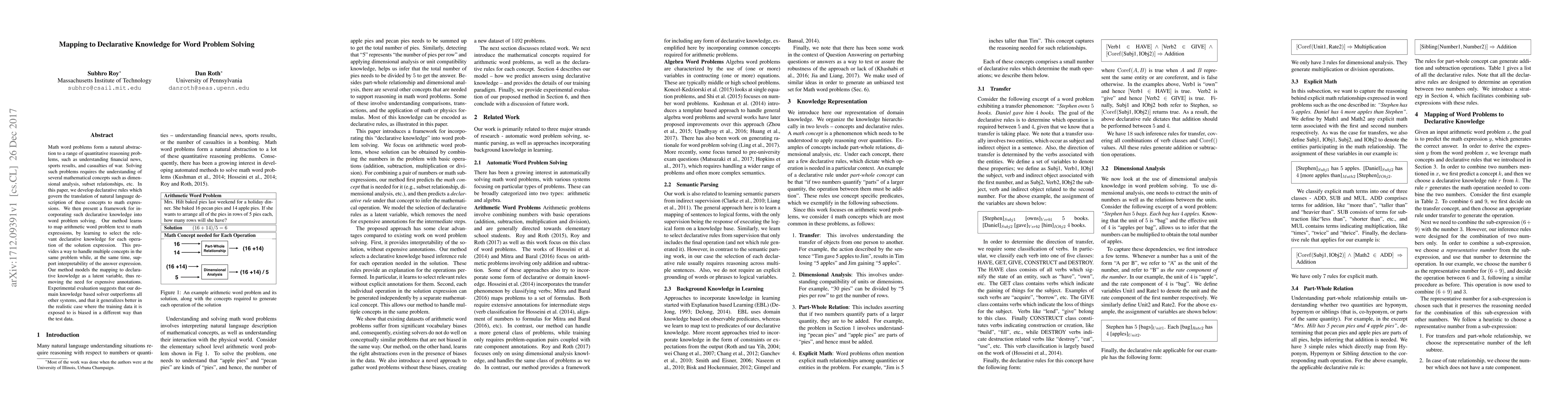 This paper develops a framework for translating natural language math word problems into mathematical expressions using declarative rules, achieving better performance and generalization compared to other systems. The method maps problem text to math expressions by selecting relevant declarative knowledge, enhancing interpretability and handling multiple concepts within a single problem.