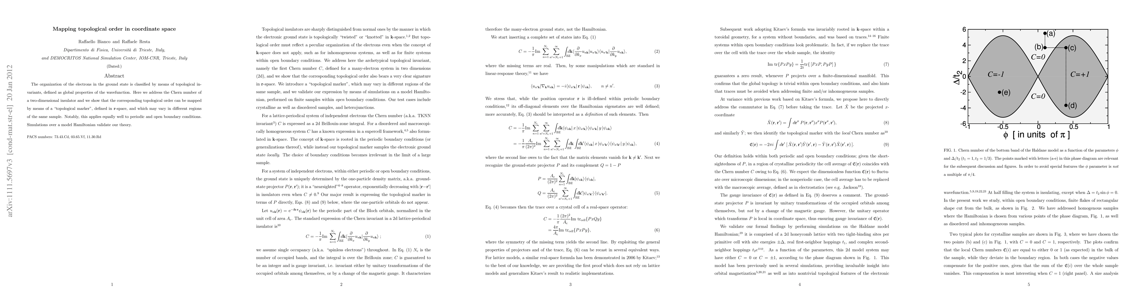 The paper demonstrates how topological order in two-dimensional insulators, specifically the Chern number, can be visualized using a "topological marker" in coordinate space, applicable to both periodic and open boundary conditions, validated by model Hamiltonian simulations.