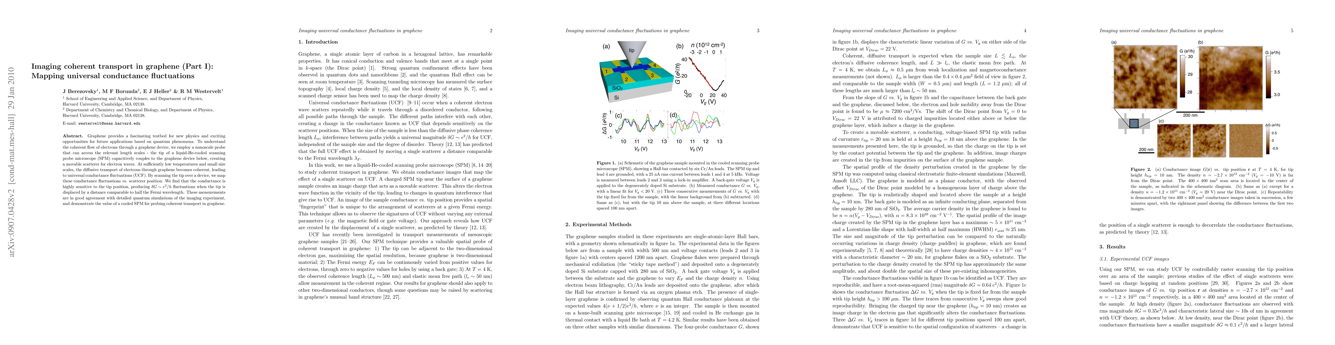 This paper investigates the coherent transport of electrons in graphene using a liquid-He-cooled scanning probe microscope, revealing universal conductance fluctuations (UCF) that are highly sensitive to the probe's position. The study confirms the theoretical predictions of UCF and highlights the effectiveness of cooled SPM in probing quantum phenomena in graphene.