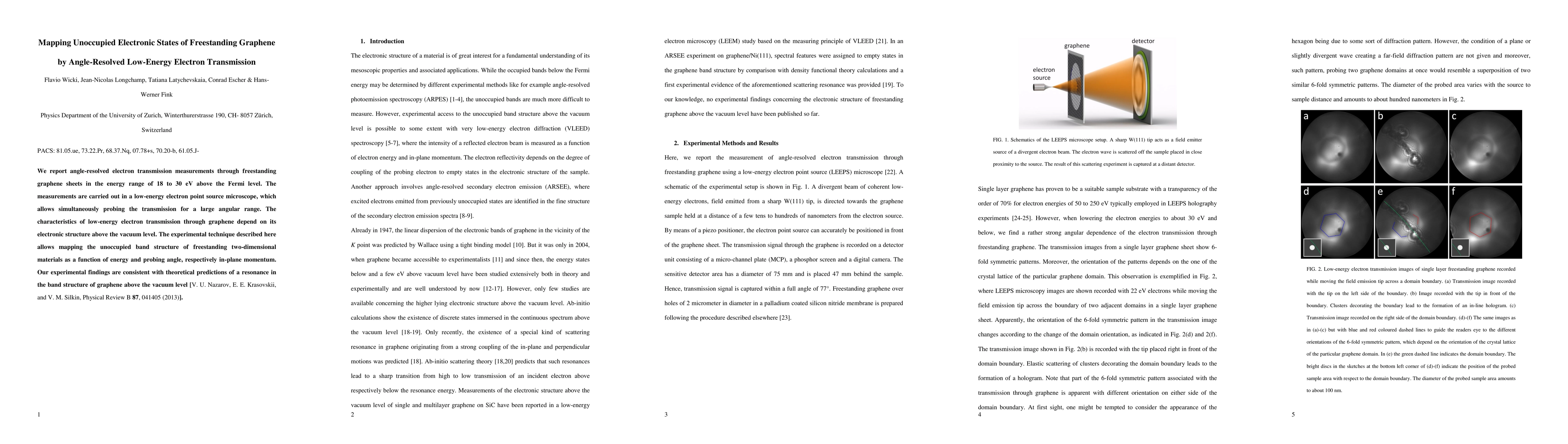 This paper reports angle-resolved electron transmission measurements through freestanding graphene, revealing its unoccupied electronic states above the Fermi level. The findings confirm theoretical predictions of a resonance in graphene's band structure, providing insights into the material's electronic structure.