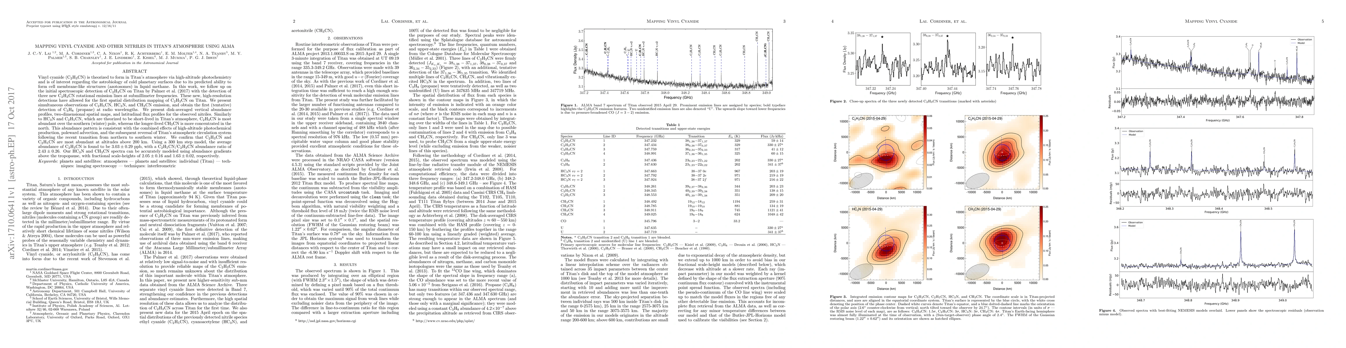 This paper uses ALMA to map vinyl cyanide (C$_2$H$_3$CN) and other nitriles in Titan's atmosphere, revealing their spatial distribution and abundance profiles. The study finds C$_2$H$_3$CN most abundant over the southern pole, consistent with photochemical production and atmospheric circulation patterns.