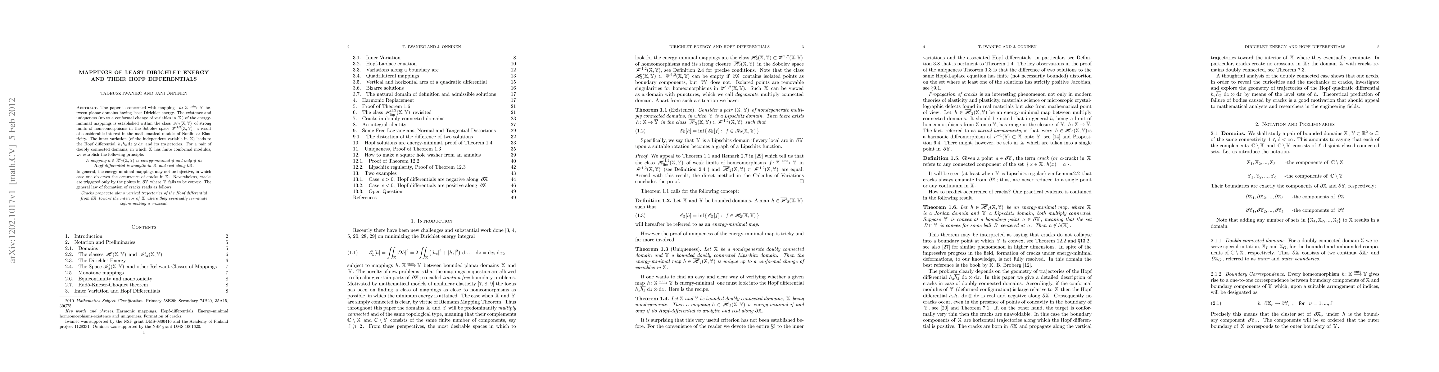 The paper is concerned with mappings between planar domains having least Dirichlet energy. The existence and uniqueness (up to a conformal change of variables in the domain) of the energy-minimal mappings is established within the class $\bar{\mathscr H}_2(X, Y)$ of strong limits of homeomorphisms in the Sobolev space $W^{1,2}(X, Y)$, a result of considerable interest in the mathematical models of Nonlinear Elasticity. The inner variation leads to the Hopf differential $h_z \bar{h_{\bar{z}}} dz \otimes dz$ and its trajectories. For a pair of doubly connected domains, in which $X$ has finite conformal modulus, we establish the following principle: A mapping $h \in \bar{\mathscr H}_2(X, Y)$ is energy-minimal if and only if its Hopf-differential is analytic in $X$ and real along the boundary of $X$. In general, the energy-minimal mappings may not be injective, in which case one observes the occurrence of cracks in $X$. Nevertheless, cracks are triggered only by the points in the boundary of $Y$ where $Y$ fails to be convex. The general law of formation of cracks reads as follows: Cracks propagate along vertical trajectories of the Hopf differential from the boundary of $X$ toward the interior of $X$ where they eventually terminate before making a crosscut.