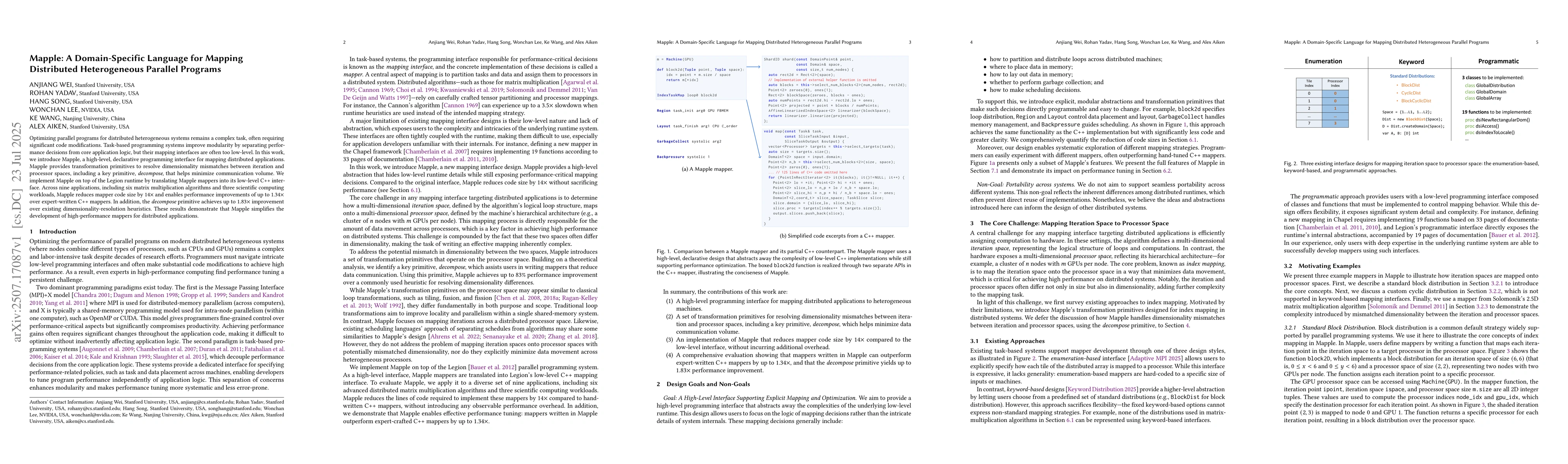 Optimizing parallel programs for distributed heterogeneous systems remains a complex task, often requiring significant code modifications. Task-based programming systems improve modularity by separating performance decisions from core application logic, but their mapping interfaces are often too low-level. In this work, we introduce Mapple, a high-level, declarative programming interface for mapping distributed applications. Mapple provides transformation primitives to resolve dimensionality mismatches between iteration and processor spaces, including a key primitive, decompose, that helps minimize communication volume. We implement Mapple on top of the Legion runtime by translating Mapple mappers into its low-level C++ interface. Across nine applications, including six matrix multiplication algorithms and three scientific computing workloads, Mapple reduces mapper code size by 14X and enables performance improvements of up to 1.34X over expert-written C++ mappers. In addition, the decompose primitive achieves up to 1.83X improvement over existing dimensionality-resolution heuristics. These results demonstrate that Mapple simplifies the development of high-performance mappers for distributed applications.