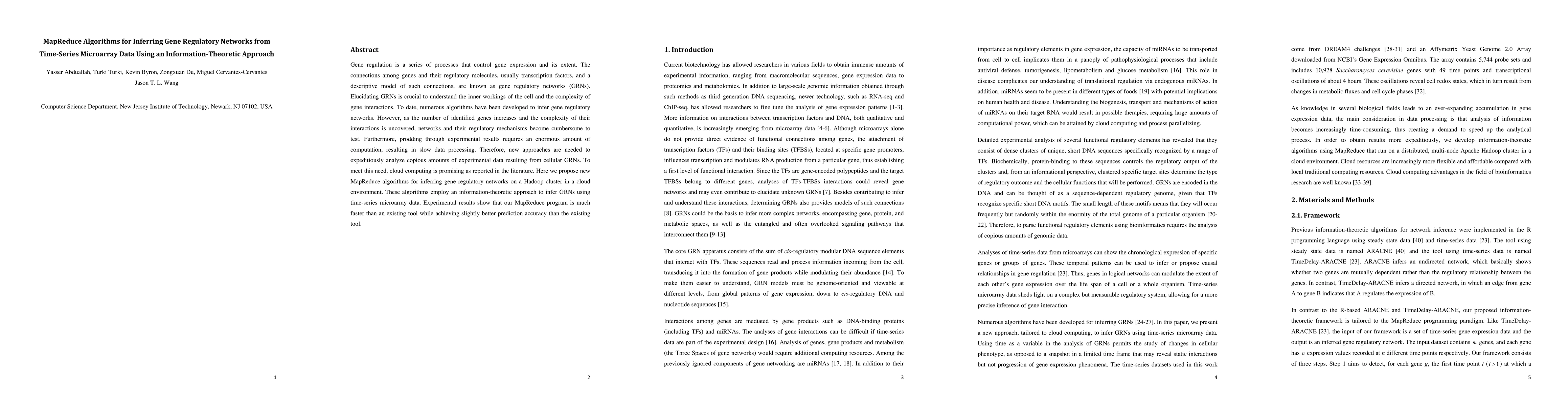 This paper proposes new MapReduce algorithms for inferring gene regulatory networks (GRNs) using cloud computing on a Hadoop cluster. The algorithms utilize an information-theoretic approach for analyzing time-series microarray data, demonstrating faster processing and slightly improved prediction accuracy compared to existing tools.