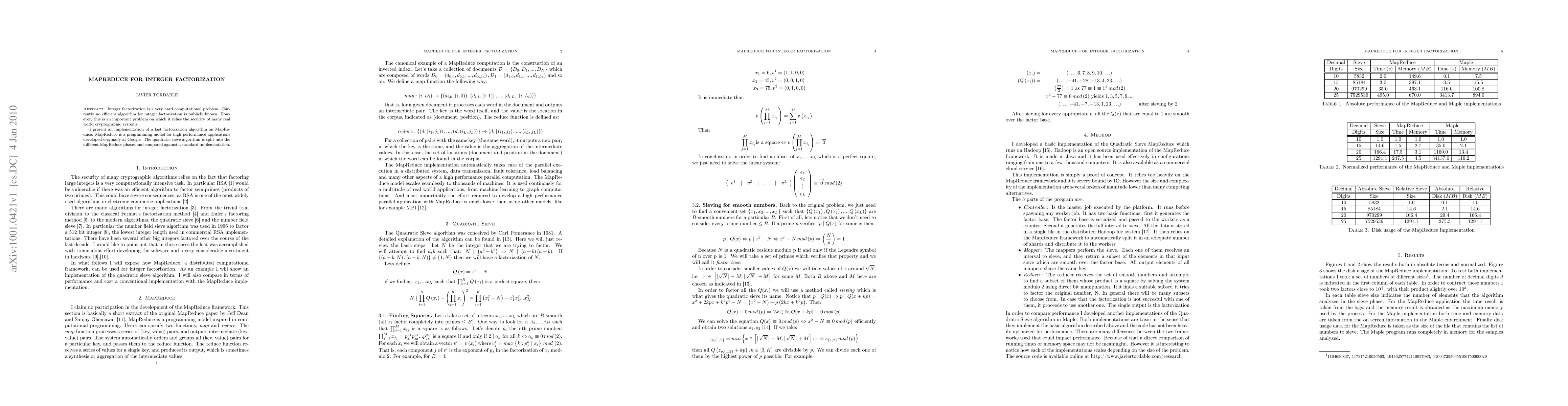 This paper presents a MapReduce implementation of the quadratic sieve algorithm for integer factorization, demonstrating its efficiency compared to standard implementations. The approach leverages the distributed computing model to tackle the computationally intensive problem, which is crucial for the security of many cryptographic systems.