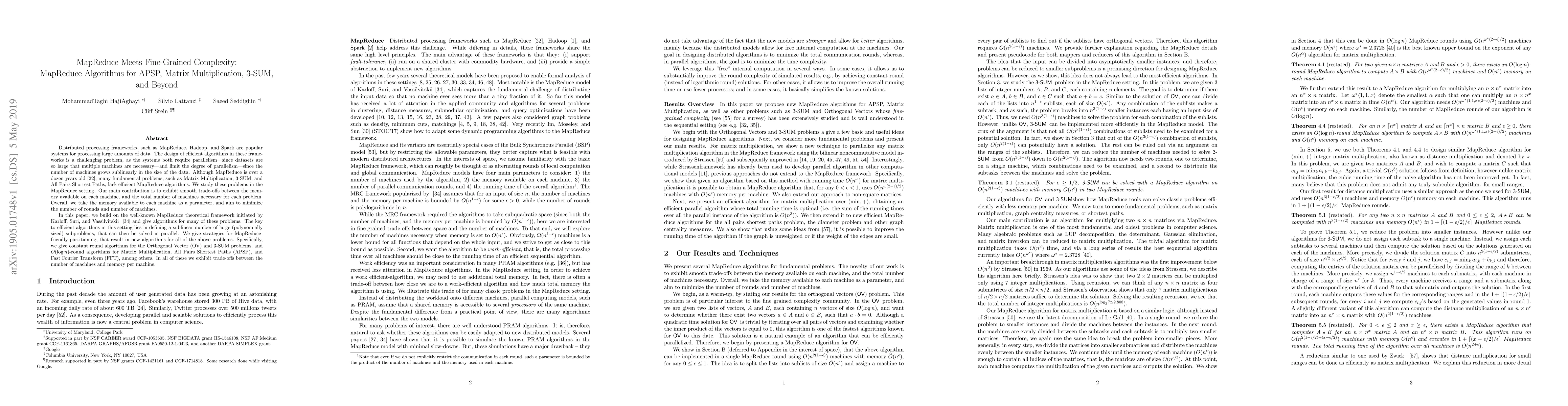 This paper develops efficient MapReduce algorithms for fundamental problems including Matrix Multiplication, All Pairs Shortest Paths (APSP), and the 3-SUM problem, providing trade-offs between memory per machine and the number of machines required. It introduces constant round algorithms for the Orthogonal Vector (OV) and 3-SUM problems, and $O(\log n)$-round algorithms for the others, leveraging sublinear, parallelizable subproblems.