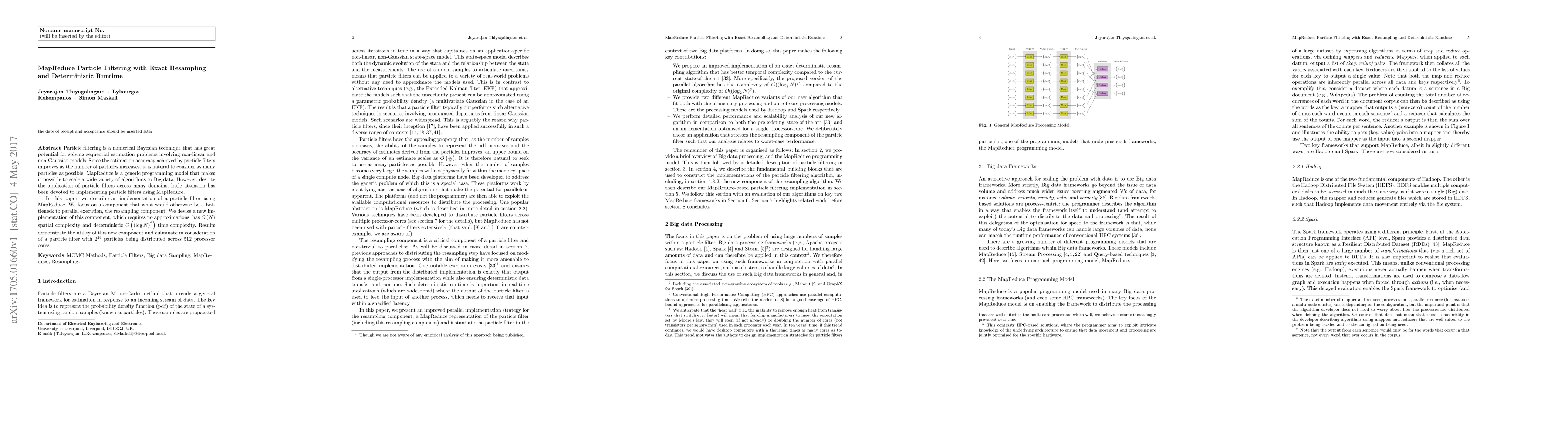 This paper presents a MapReduce implementation of particle filtering, focusing on an exact resampling method that maintains $O(N)$ spatial complexity and $O((\log N)^2)$ deterministic runtime complexity. The approach enables scaling of particle filters to large datasets and demonstrates the feasibility of distributing $2^{24}$ particles across 512 processor cores.