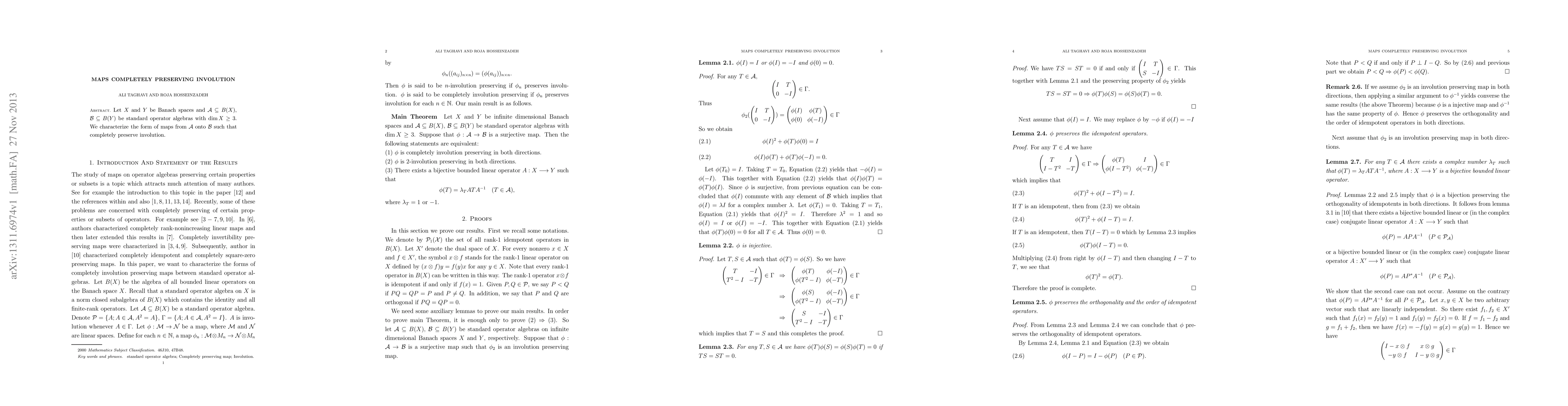 This paper characterizes the structure of maps between two operator algebras, A and B, on Banach spaces X and Y respectively, that completely preserve involution when the dimension of X is greater than 3. The findings provide a detailed description of such maps.