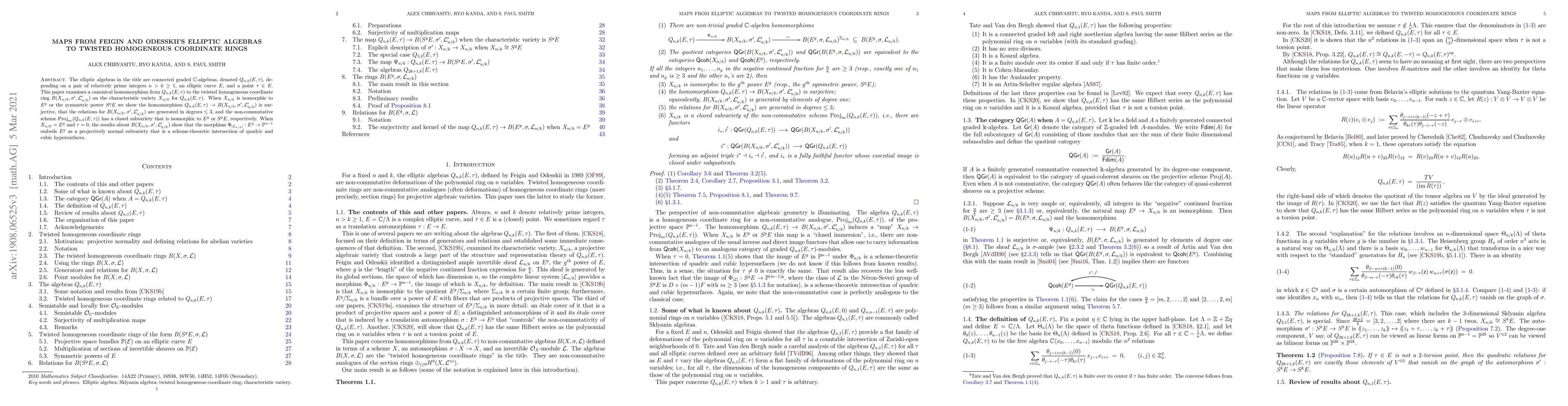 The elliptic algebras in the title are connected graded $\mathbb{C}$-algebras, denoted $Q_{n,k}(E,\tau)$, depending on a pair of relatively prime integers $n>k\ge 1$, an elliptic curve $E$, and a point $\tau\in E$. This paper examines a canonical homomorphism from $Q_{n,k}(E,\tau)$ to the twisted homogeneous coordinate ring $B(X_{n/k},\sigma',\mathcal{L}'_{n/k})$ on the characteristic variety $X_{n/k}$ for $Q_{n,k}(E,\tau)$. When $X_{n/k}$ is isomorphic to $E^g$ or the symmetric power $S^gE$ we show the homomorphism $Q_{n,k}(E,\tau) \to B(X_{n/k},\sigma',\mathcal{L}'_{n/k})$ is surjective, that the relations for $B(X_{n/k},\sigma',\mathcal{L}'_{n/k})$ are generated in degrees $\le 3$, and the non-commutative scheme $\mathrm{Proj}_{nc}(Q_{n,k}(E,\tau))$ has a closed subvariety that is isomorphic to $E^g$ or $S^gE$, respectively. When $X_{n/k}=E^g$ and $\tau=0$, the results about $B(X_{n/k},\sigma',\mathcal{L}'_{n/k})$ show that the morphism $\Phi_{|\mathcal{L}_{n/k}|}:E^g \to \mathbb{P}^{n-1}$ embeds $E^g$ as a projectively normal subvariety that is a scheme-theoretic intersection of quadric and cubic hypersurfaces.