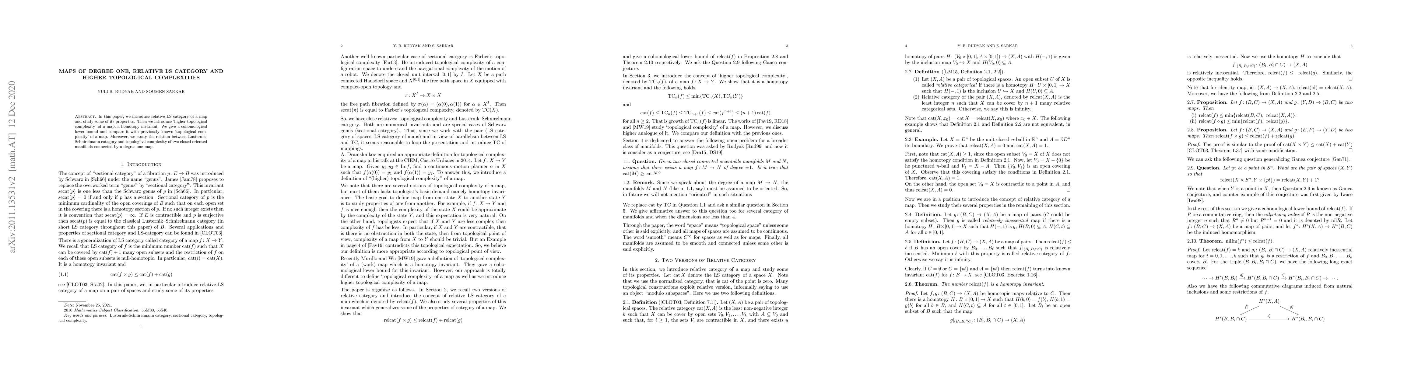 This paper introduces the relative LS category of a map and explores its properties, alongside defining a new homotopy invariant termed 'higher topological complexity'. It provides a cohomological lower bound for this new concept and compares it with the previously known 'topological complexity', while also investigating the relationship between the Lusternik-Schnirelmann category and topological complexity in the context of degree one maps between closed oriented manifolds.
