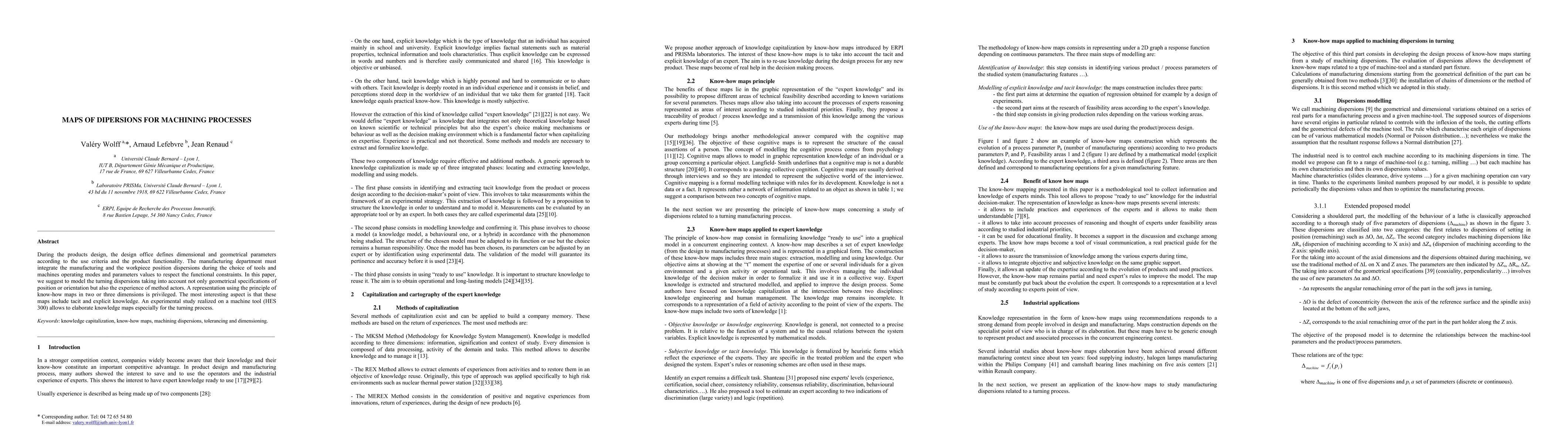 During the products design, the design office defines dimensional and geometrical parameters according to the use criteria and the product functionality. The manufacturing department must integrate the manufacturing and the workpiece position dispersions during the choice of tools and machines operating modes and parameters values to respect the functional constraints. In this paper, we suggest to model the turning dispersions taking into account not only geometrical specifications of position or orientation but also the experience of method actors. A representation using the principle of know-how maps in two or three dimensions is privileged. The most interesting aspect is that these maps include tacit and explicit knowledge. An experimental study realized on a machine tool (HES 300) allows to elaborate knowledge maps especially for the turning process.