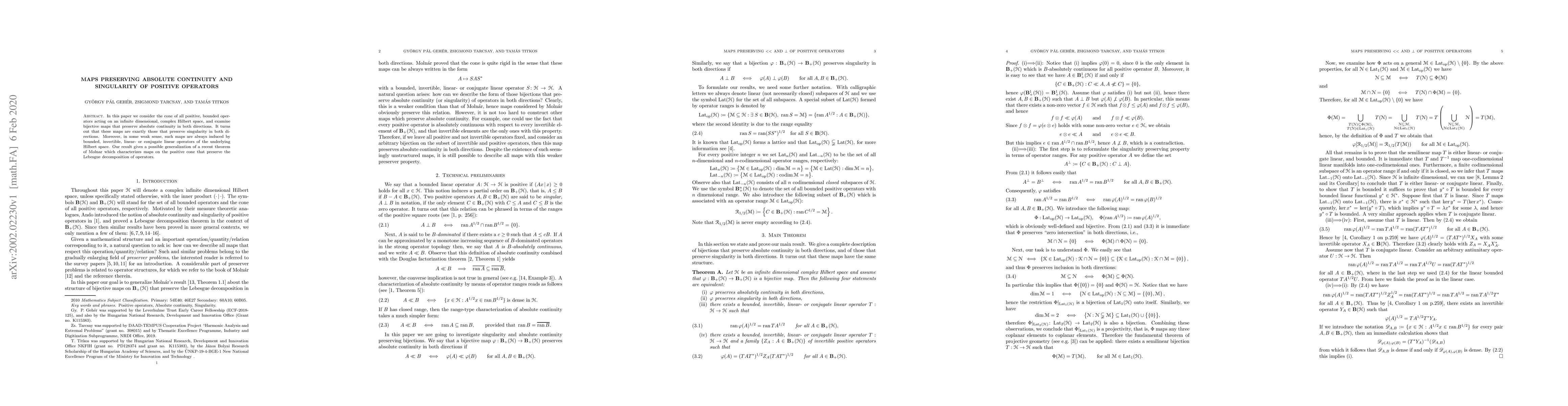 This paper investigates bijective maps that preserve absolute continuity of positive, bounded operators on an infinite-dimensional complex Hilbert space, revealing they also preserve singularity. Such maps are shown to be induced by bounded, invertible linear or conjugate linear operators.
