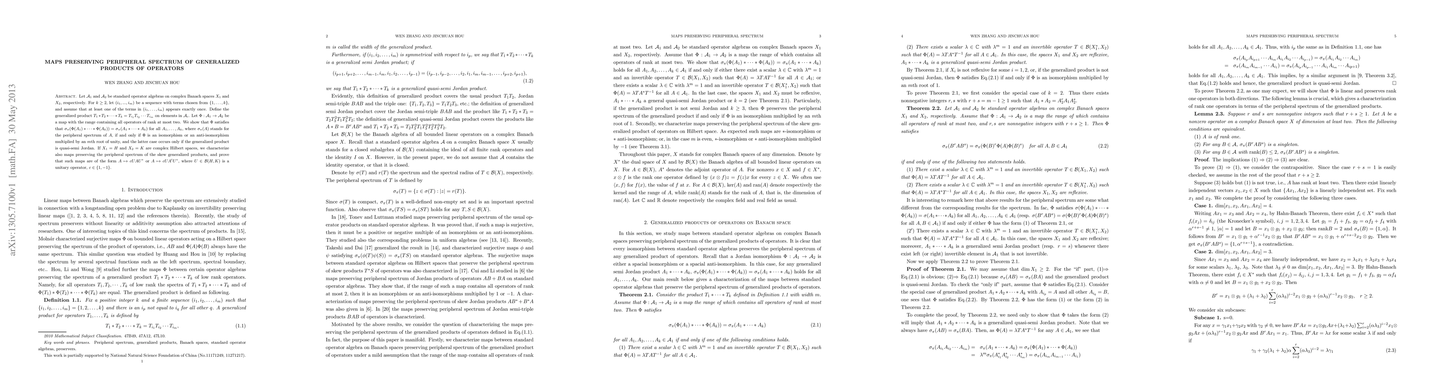 Let $\mathcal{A}_1$ and $\mathcal{A}_2$ be standard operator algebras on complex Banach spaces $X_1$ and $X_2$, respectively. For $k\geq2$, let $(i_1,...,i_m)$ be a sequence with terms chosen from $\{1,\ldots,k\}$, and assume that at least one of the terms in $(i_1,\ldots,i_m)$ appears exactly once. Define the generalized product $T_1* T_2*\cdots* T_k=T_{i_1}T_{i_2}\cdots T_{i_m}$ on elements in $\mathcal{A}_i$. Let $\Phi:\mathcal{A}_1\rightarrow\mathcal{A}_2$ be a map with the range containing all operators of rank at most two. We show that $\Phi$ satisfies that $\sigma_\pi(\Phi(A_1)*\cdots*\Phi(A_k))=\sigma_\pi(A_1*\cdots* A_k)$ for all $A_1,\ldots, A_k$, where $\sigma_\pi(A)$ stands for the peripheral spectrum of $A$, if and only if $\Phi$ is an isomorphism or an anti-isomorphism multiplied by an $m$th root of unity, and the latter case occurs only if the generalized product is quasi-semi Jordan. If $X_1=H$ and $X_2=K$ are complex Hilbert spaces, we characterize also maps preserving the peripheral spectrum of the skew generalized products, and prove that such maps are of the form $A\mapsto cUAU^*$ or $A\mapsto cUA^tU^*$, where $U\in\mathcal{B}(H,K)$ is a unitary operator, $c\in\{1,-1\}$.