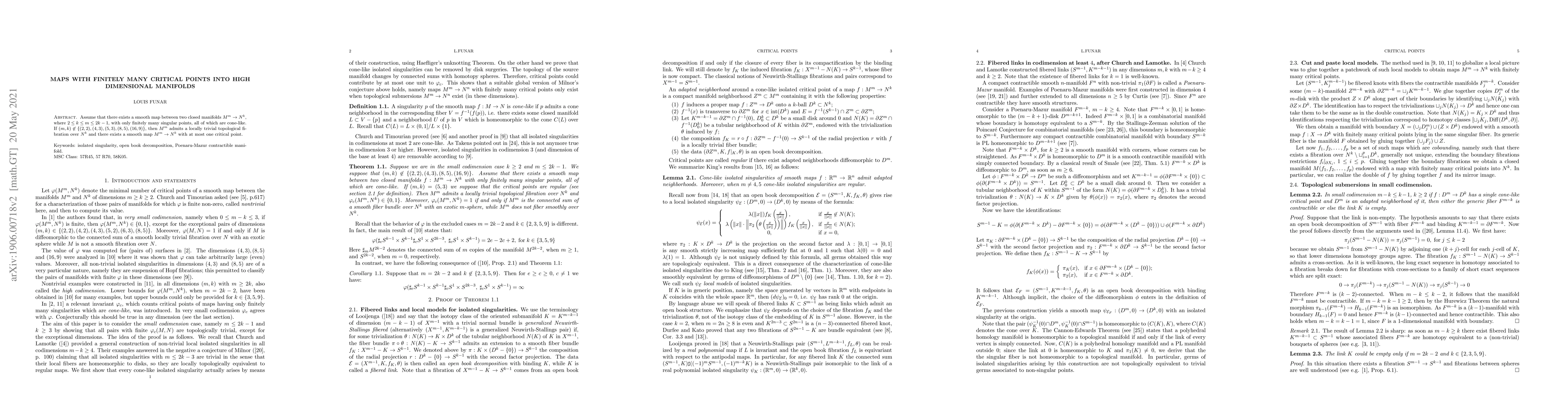 Assume that there exists a smooth map between two closed manifolds $M^m\to N^k$ with only finitely many cone-like singular points, where $2\leq k\leq m\leq 2k-1$. If $(m,k)\not\in\{(2,2), (4,3), (5,3), (8,5), (16,9)\}$, then $M^m$ admits a locally trivial topological fibration over $N^k$ and there exists a smooth map $M^m\to N^k$ with at most one critical point.