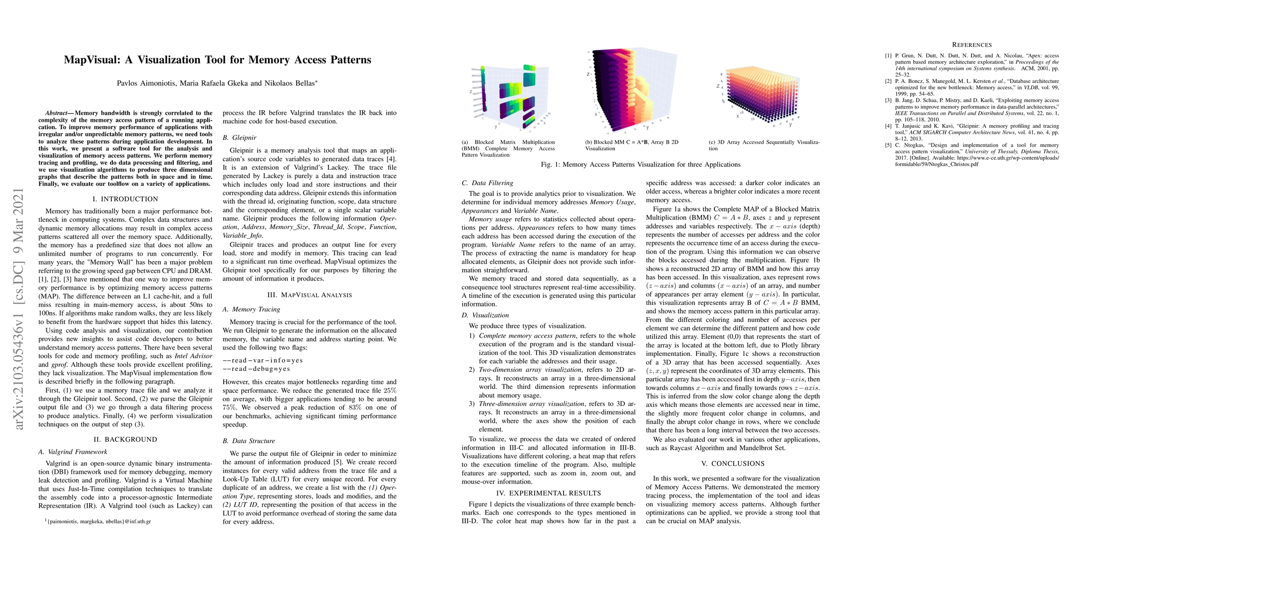 MapVisual is a software tool designed to analyze and visualize memory access patterns, aiding in the optimization of memory performance for applications with irregular memory access. It employs memory tracing, profiling, and visualization algorithms to produce three-dimensional graphs representing these patterns in both spatial and temporal dimensions, and it has been evaluated across various applications.