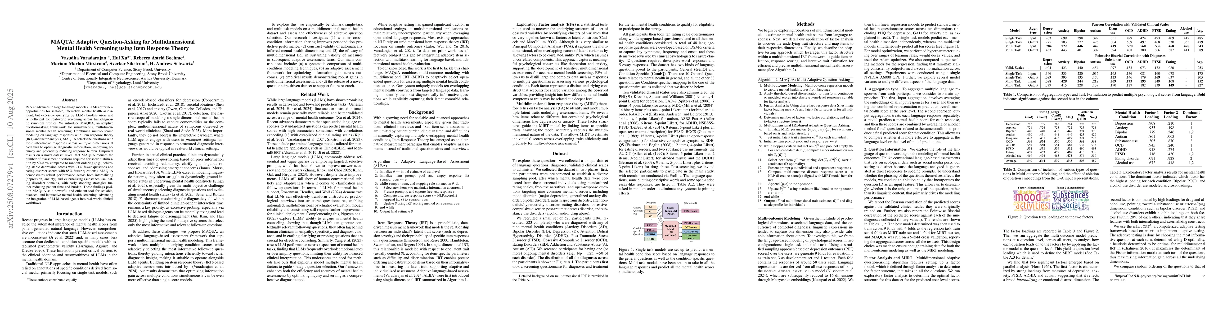 The research introduces MAQuA, an adaptive question-asking framework for multidimensional mental health screening using item response theory (IRT) and factor analysis, combining multi-outcome modeling on language responses to optimize diagnostic information.