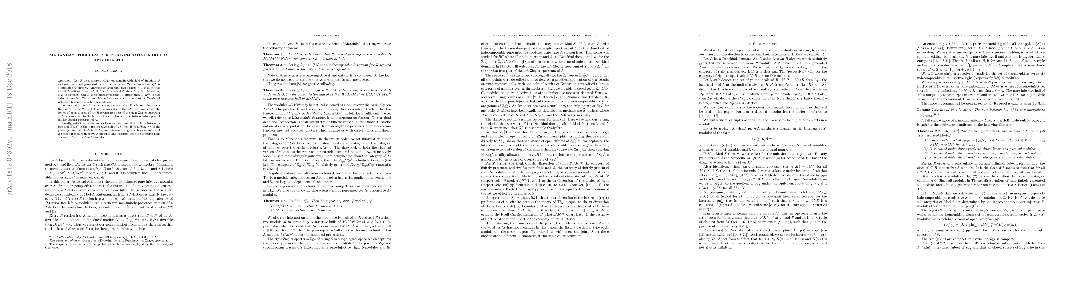 This paper extends Maranda's theorem to $R$-reduced $R$-torsion-free pure-injective $\Lambda$-modules, showing that if $L/L\pi^k \simeq M/M\pi^k$ then $L \simeq M$ and $L/L\pi^k$ is indecomposable if $L$ is indecomposable. It also demonstrates duality between the right and left Ziegler spectra of $\Lambda$ over a Dedekind domain $R$ and characterizes $R$-torsion-free pure-injective $\Lambda$-modules.